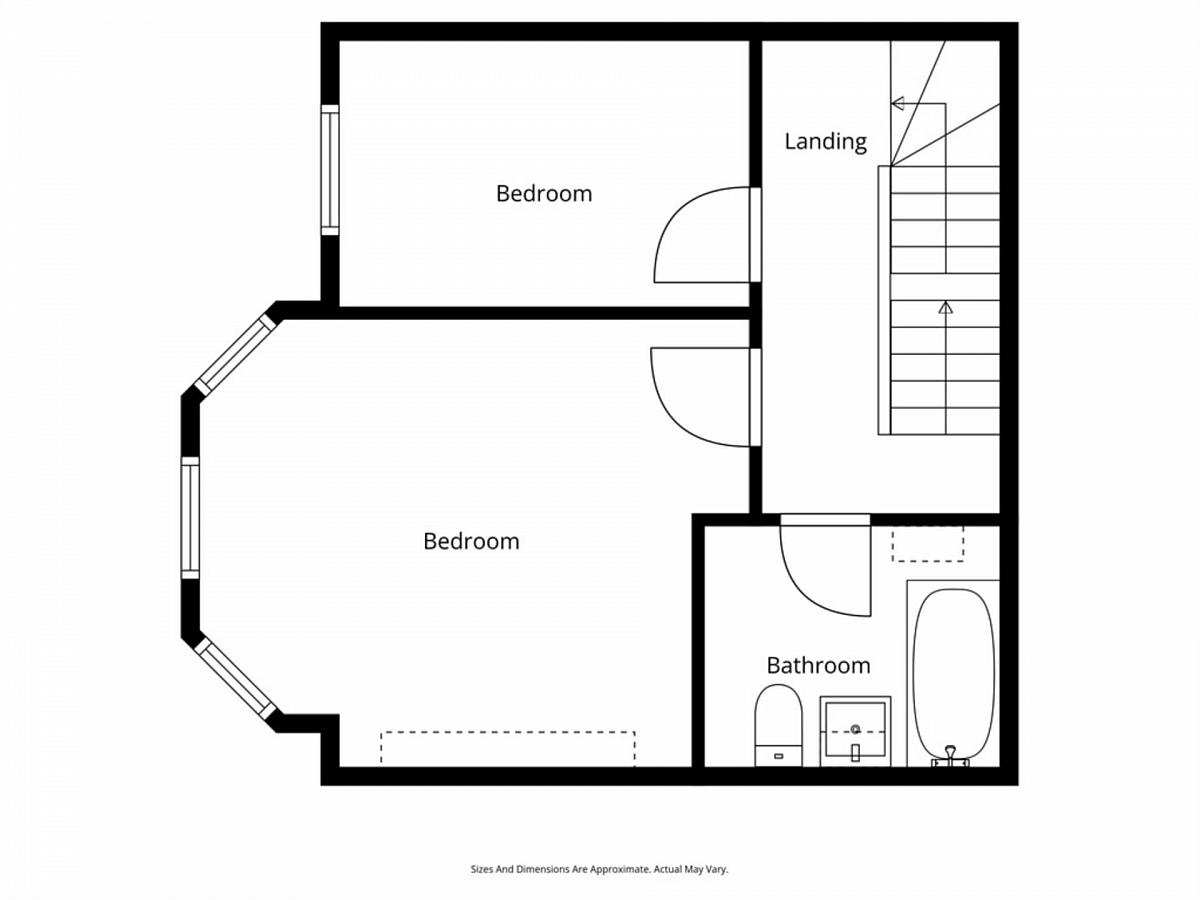 First floor:- Luxury white bathroom suite, bedroom 3, Lounge / bedroom 2 with feature bay window.