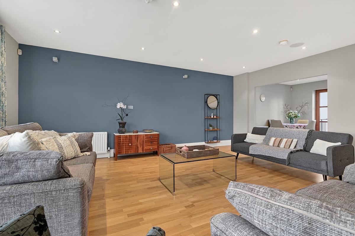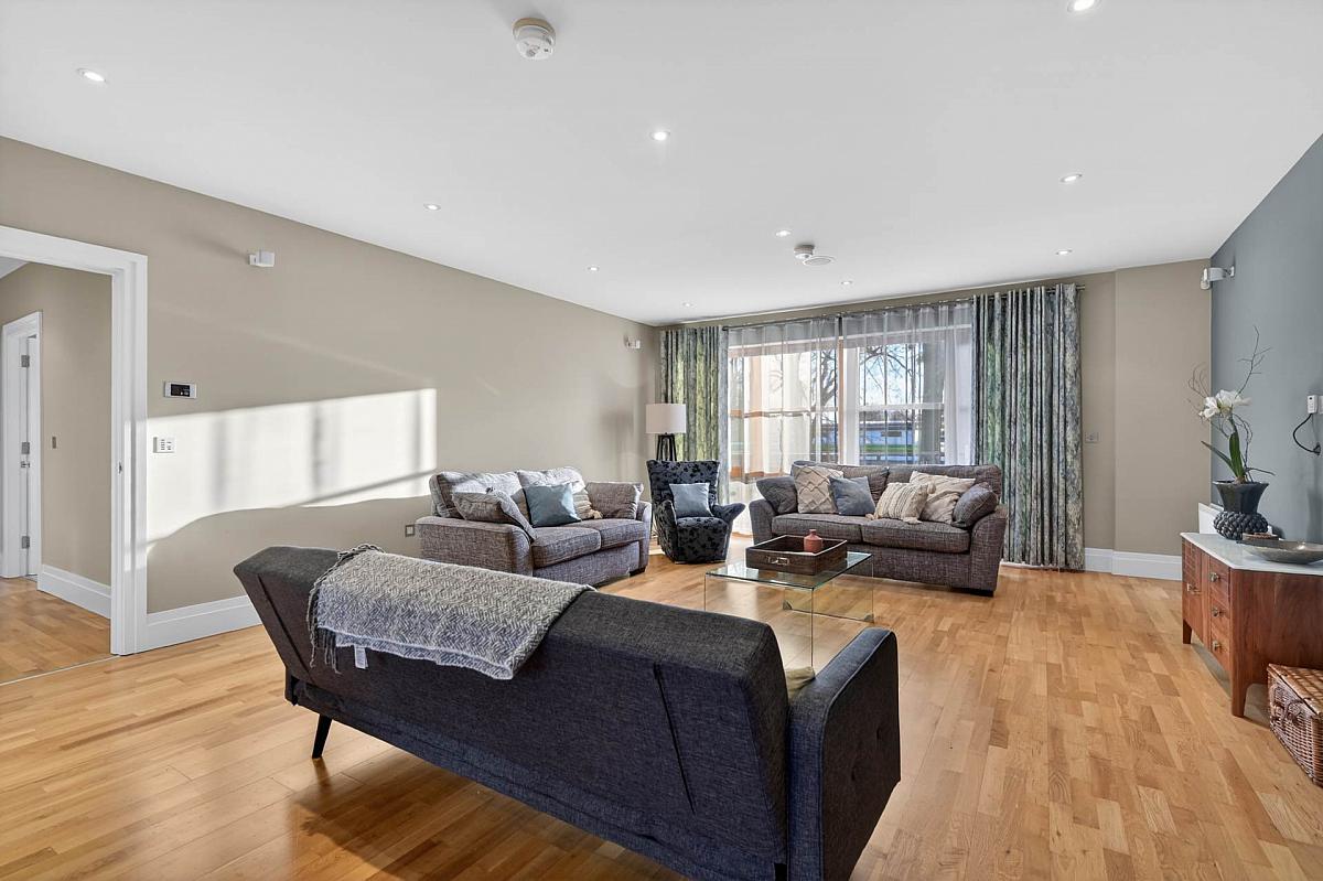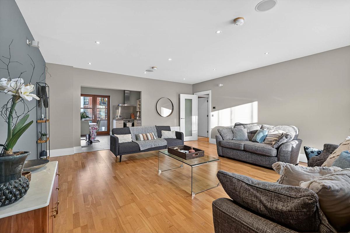 Bright and spacious first floor apartment extending to over 1400 sq ft, featuring an impressive open-plan living and dining area with access to a private balcony's front and rear, alongside a fully fitted kitchen complete with integrated appliances.