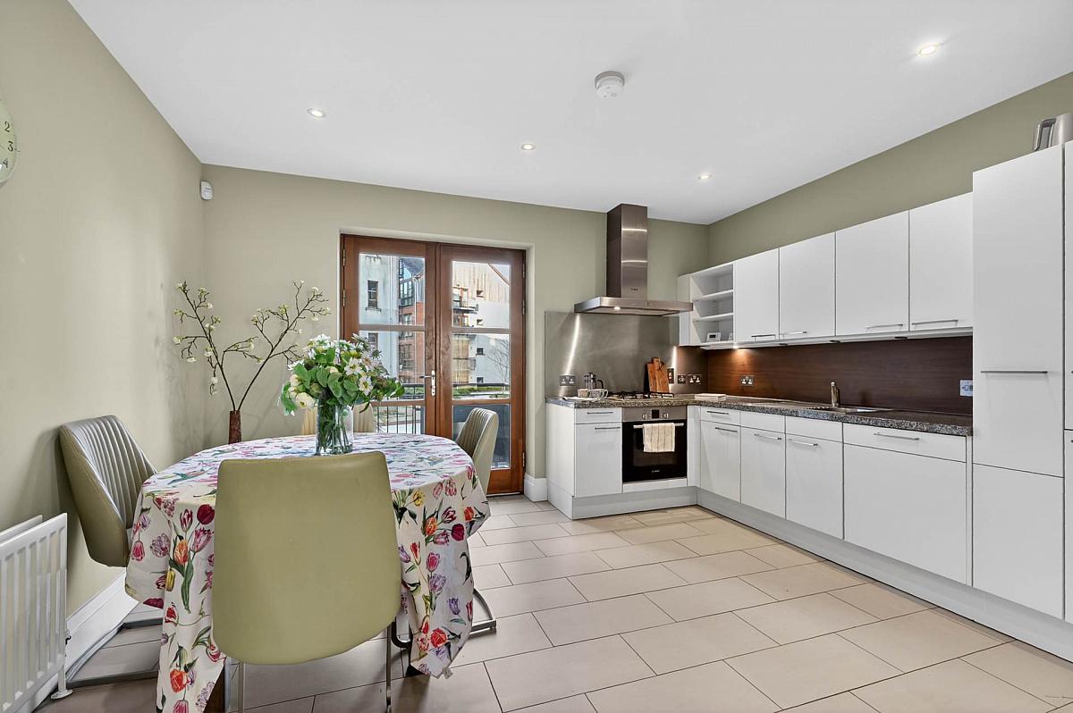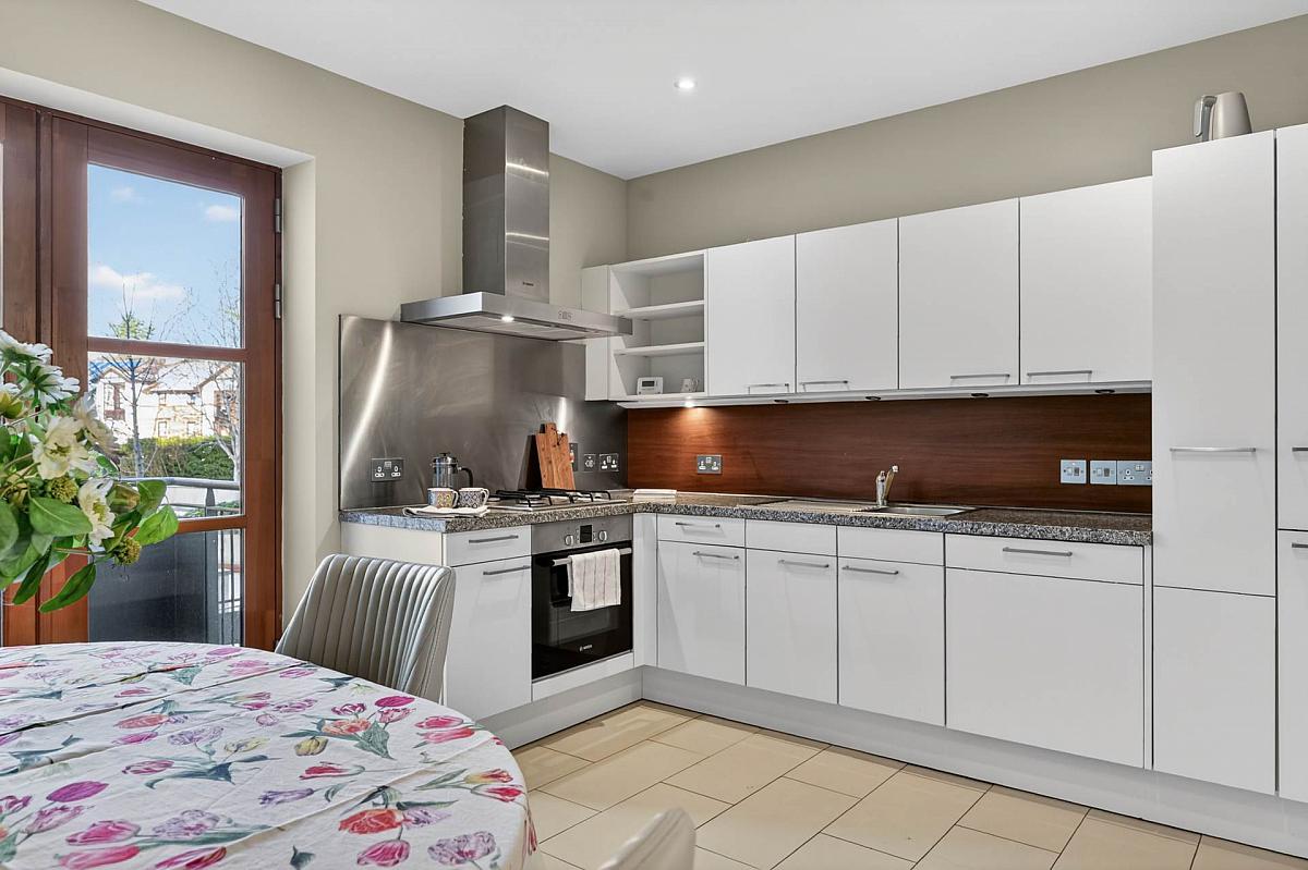 Modern fitted white kitchen with granite work surfaces, integrated appliances including dishwasher, gas hot and electric oven. Tile flooring and patio door leading to rear balcony overlooking communal courtyard.