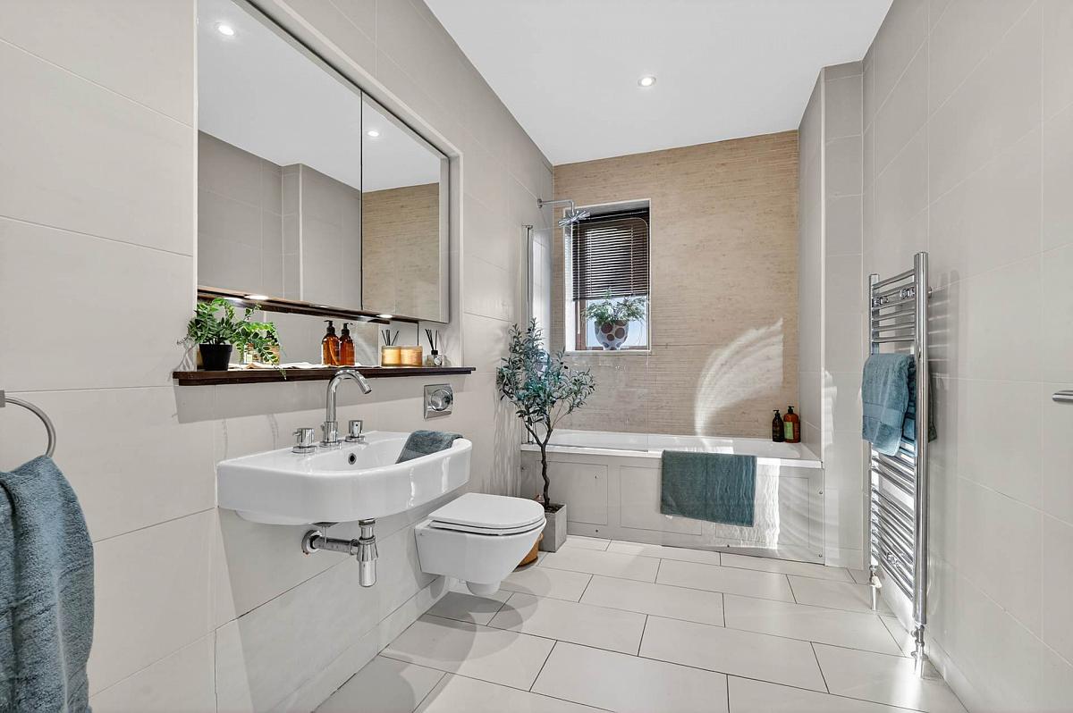 Large contemporary bathroom with white bath suite recesses, mirrored bathroom cabinet and fully tiled walls and flooring.