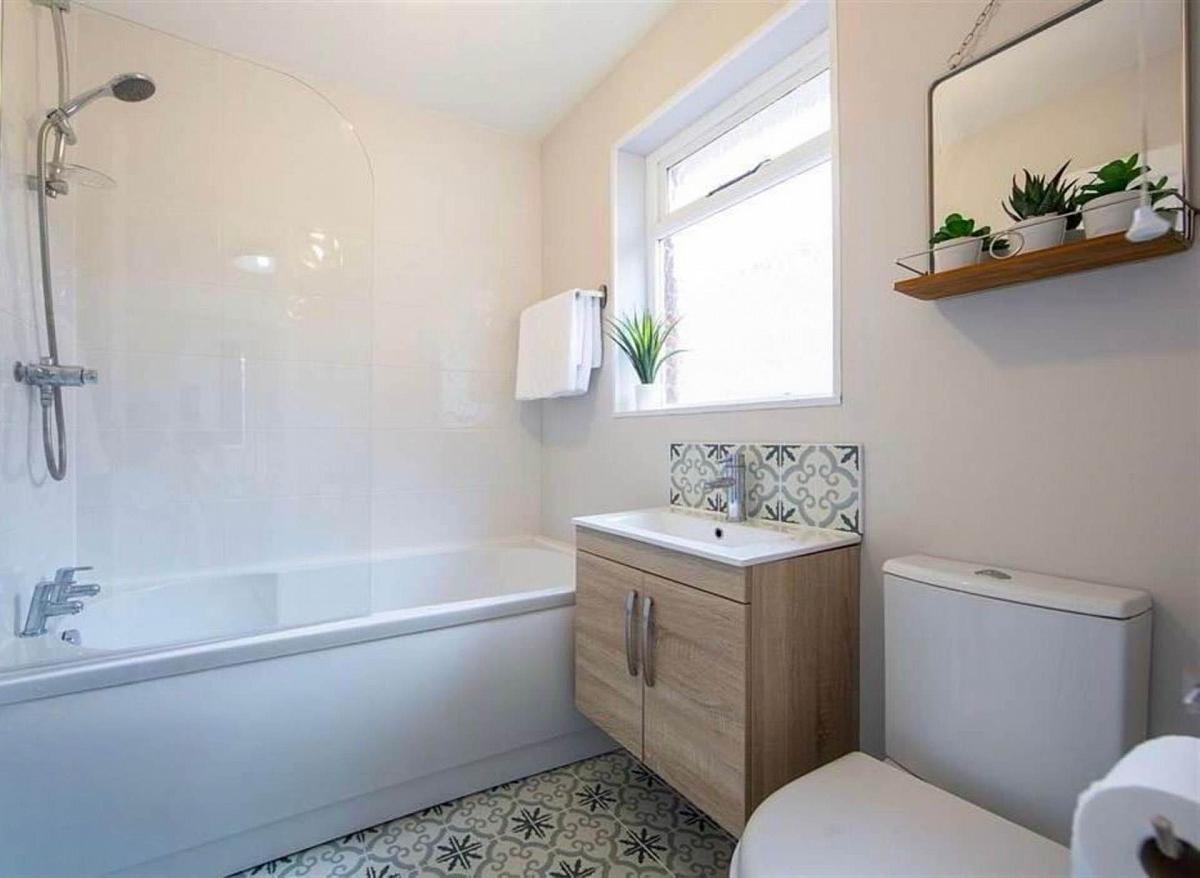Bathroom suite with vanity cupboard, low flush toilet, shower over the bath. Tiled floors and part tiled walls.