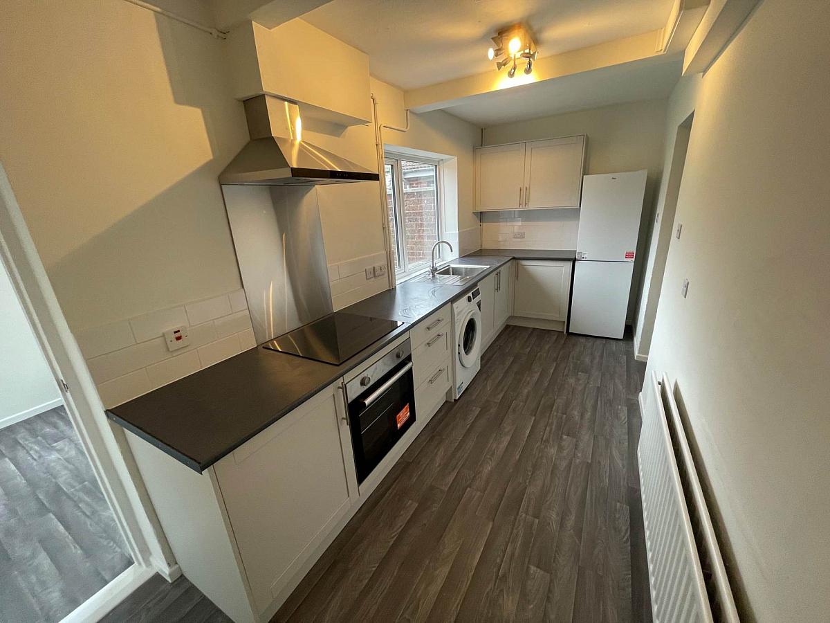 Newly installed grey kitchen with new oven & hob, Fridge freezer and washing machine.