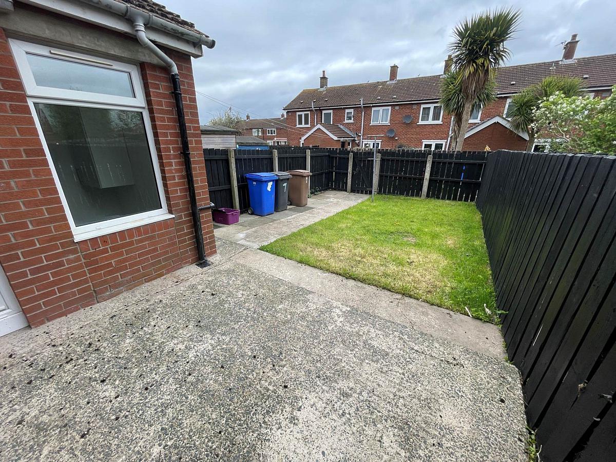 Rear garden laid to lawn with concrete path and patio