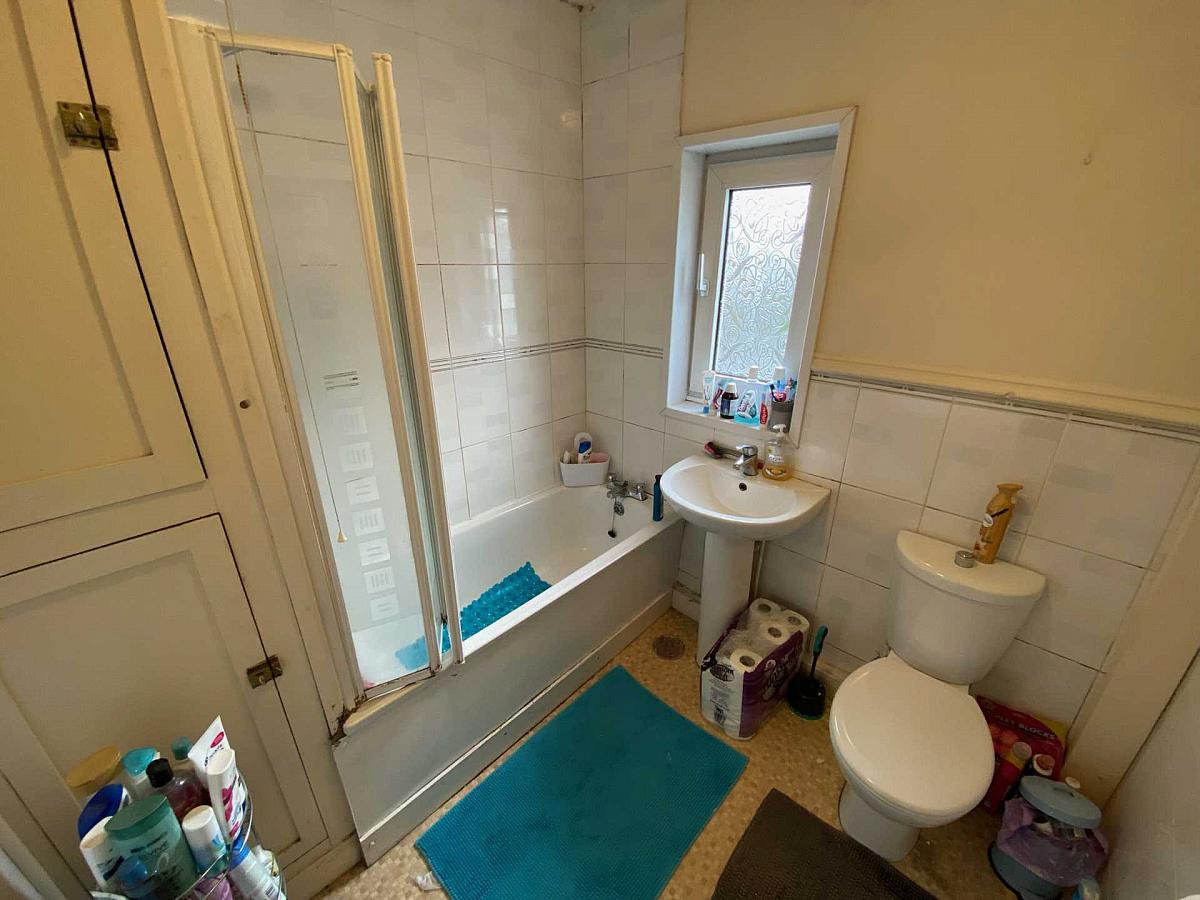 Bathroom with white 3 piece bath suite and electric shower over, part tiled walls and lino flooring.