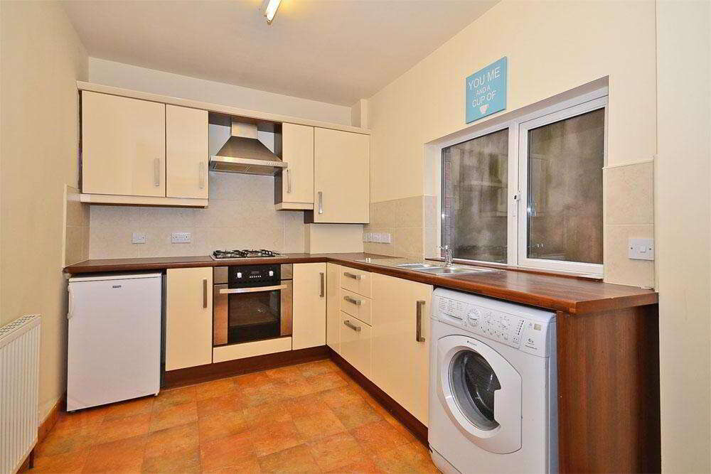 The kitchen has lino flooring, nice modern style kitchen units, oven with overhead extractor fan, fridge freezer unit and washing machine.