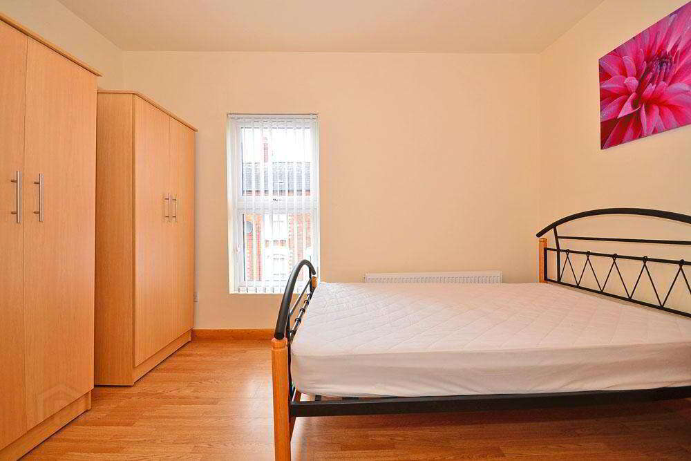 The master bedroom is a double with laminate flooring, two wardrobes and a bedside table.