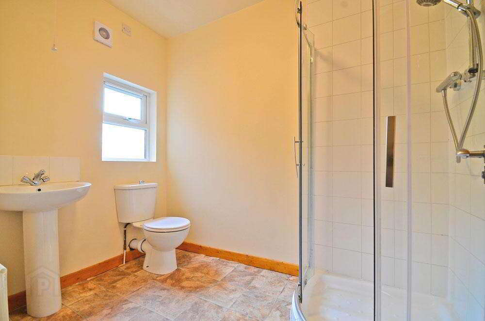 The bathroom has lino flooring and provides a toilet, wash hand basin and standing corner shower.