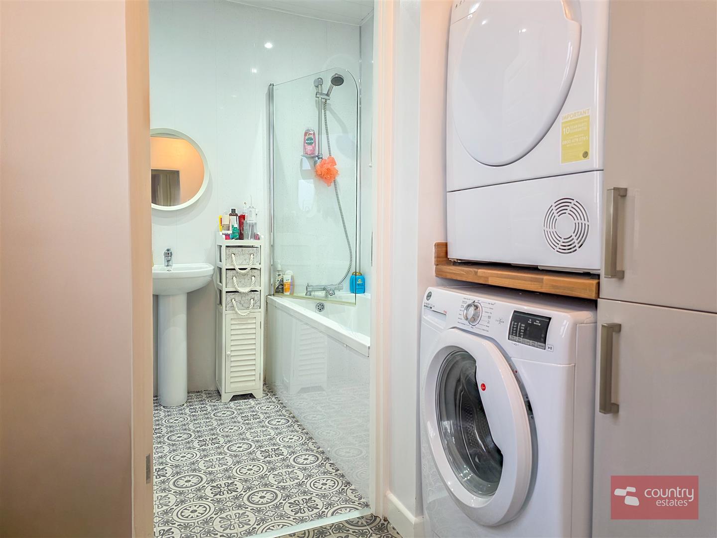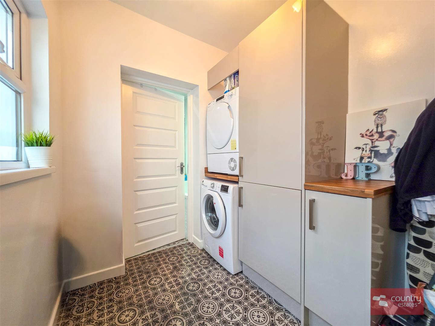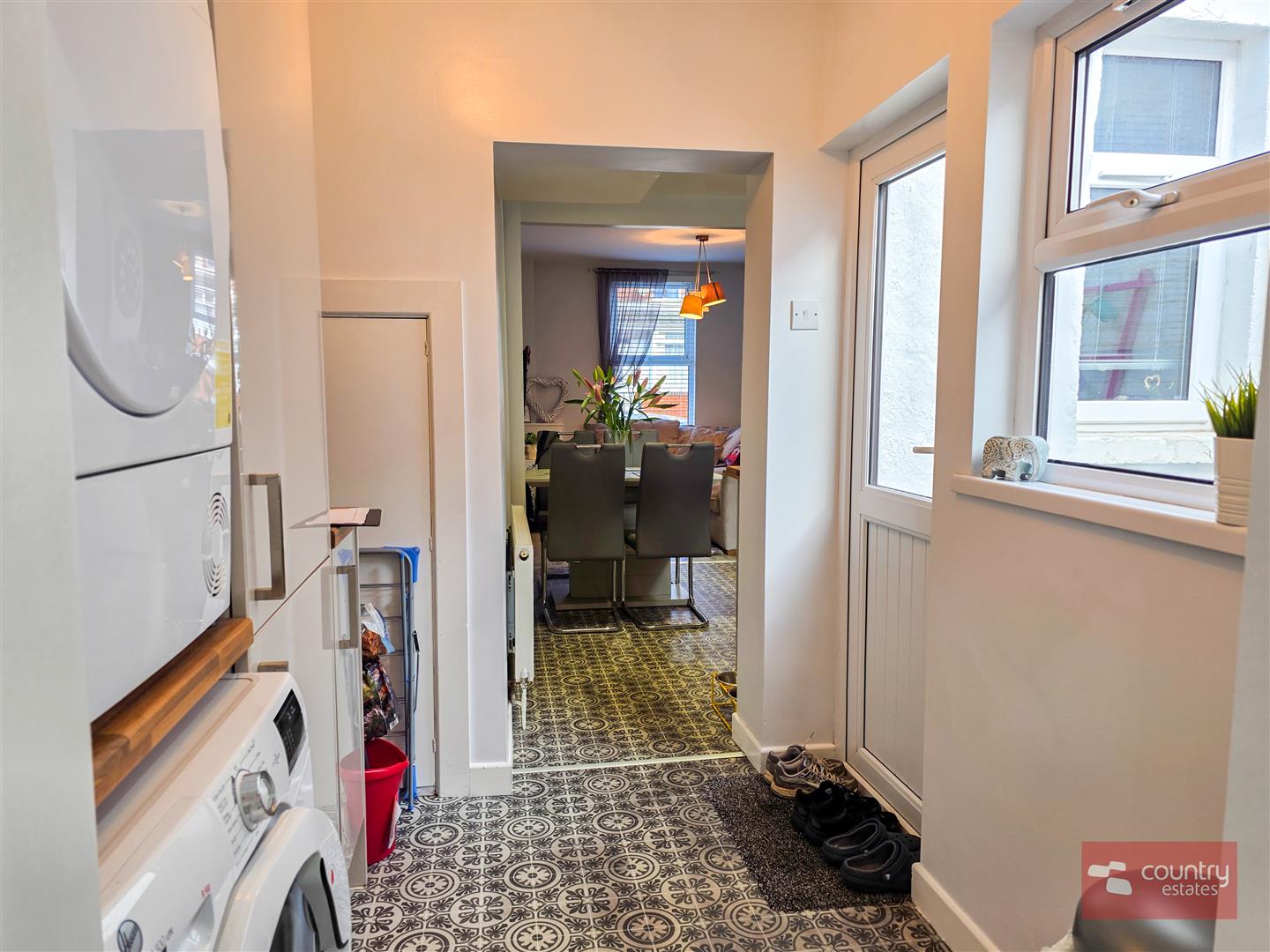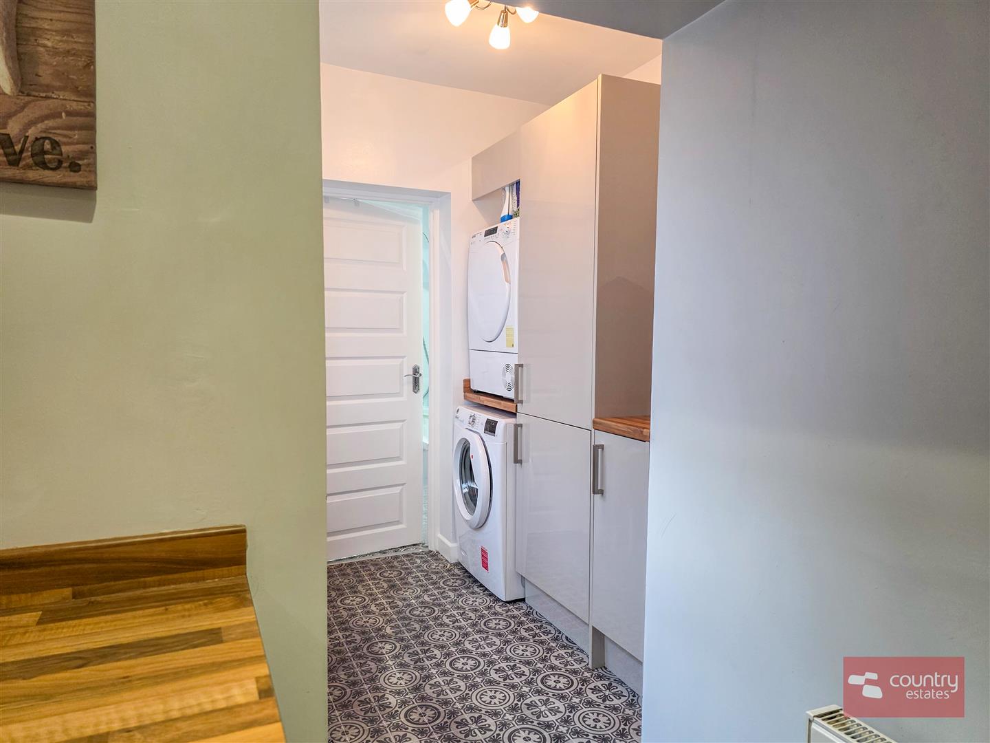Integrated fridge freezer. Plumbed for washing machine and space for tumble dryer. Worktop for appliances. Low storage unit. Understairs storage cupboard. PVC double glazed door to rear yard.