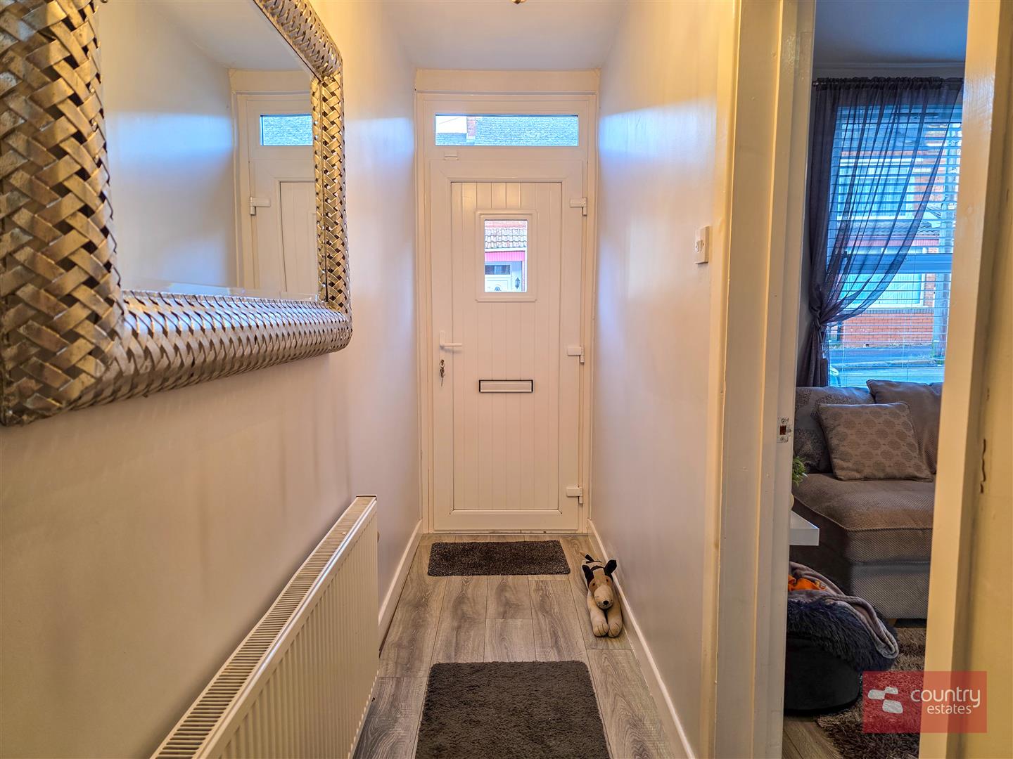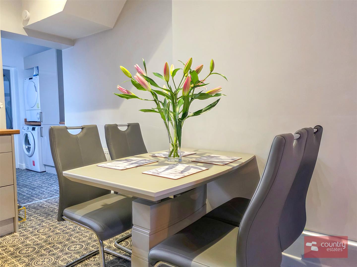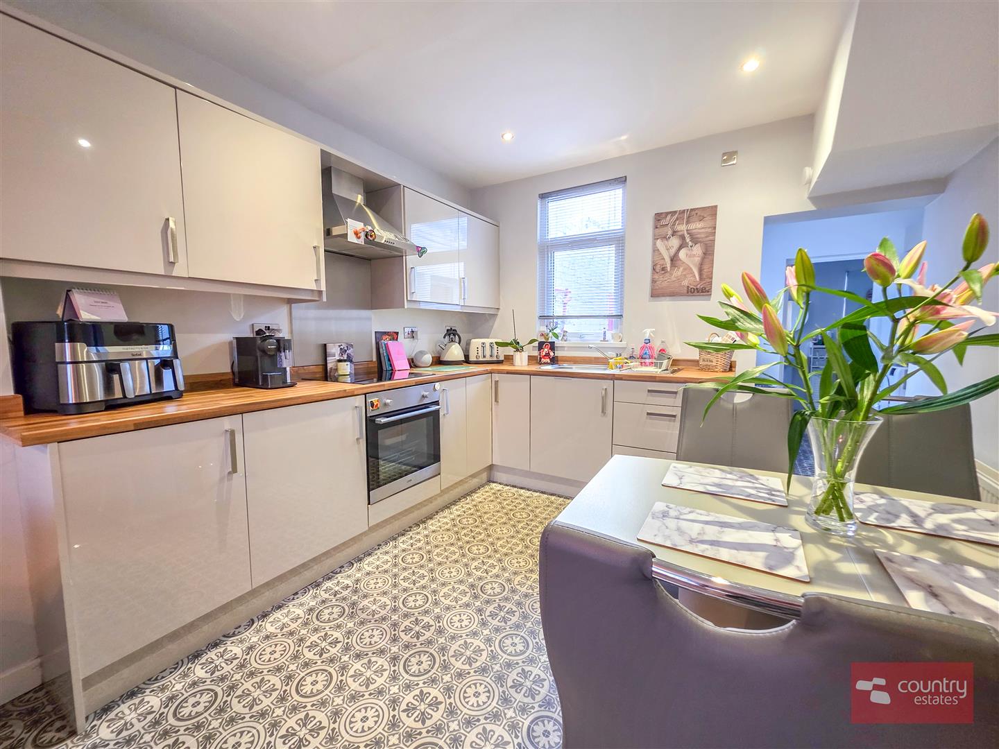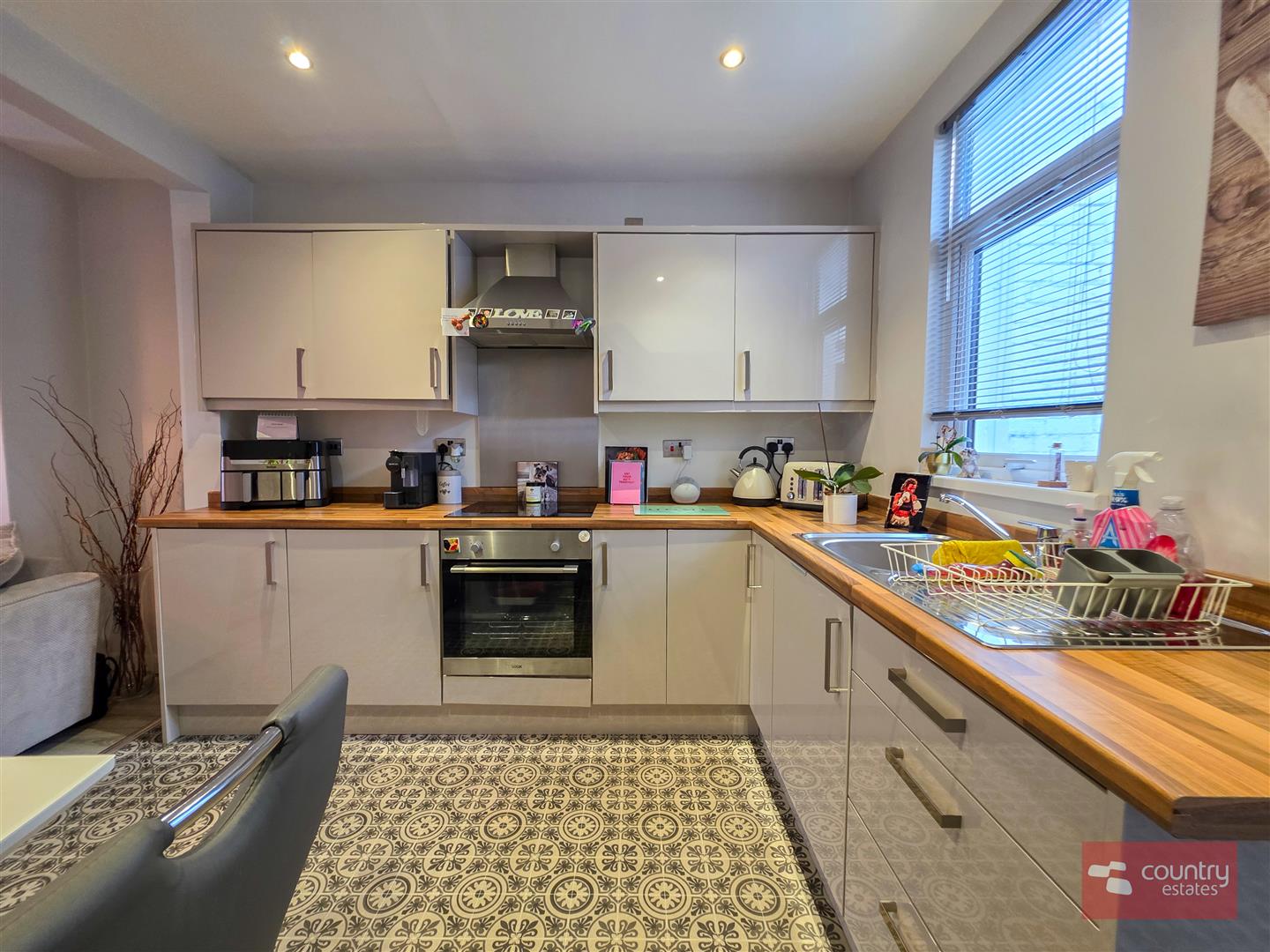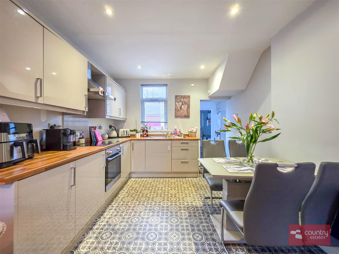 Integrated fridge freezer. Plumbed for washing machine and space for tumble dryer. Worktop for appliances. Low storage unit. Understairs storage cupboard. PVC double glazed door to rear yard.