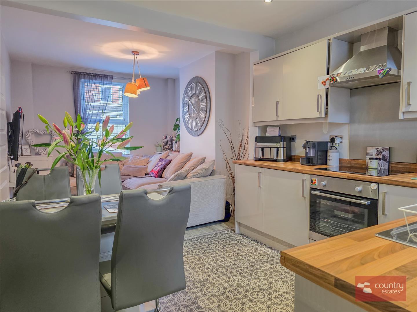 Contemporary fitted kitchen equipped with a comprehensive range of high and low level gloss fitted units with contrasting butcher block effect work surfaces and upstands. Single drainer stainless steel sink unit with monobloc tap. Integrated oven with separate four ring electric hob and overhead extractor fan housed in stainless steel canopy. Recessed Downlighting. Space for casual dining. Open into: