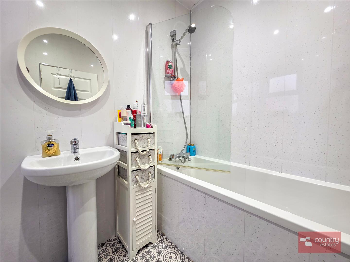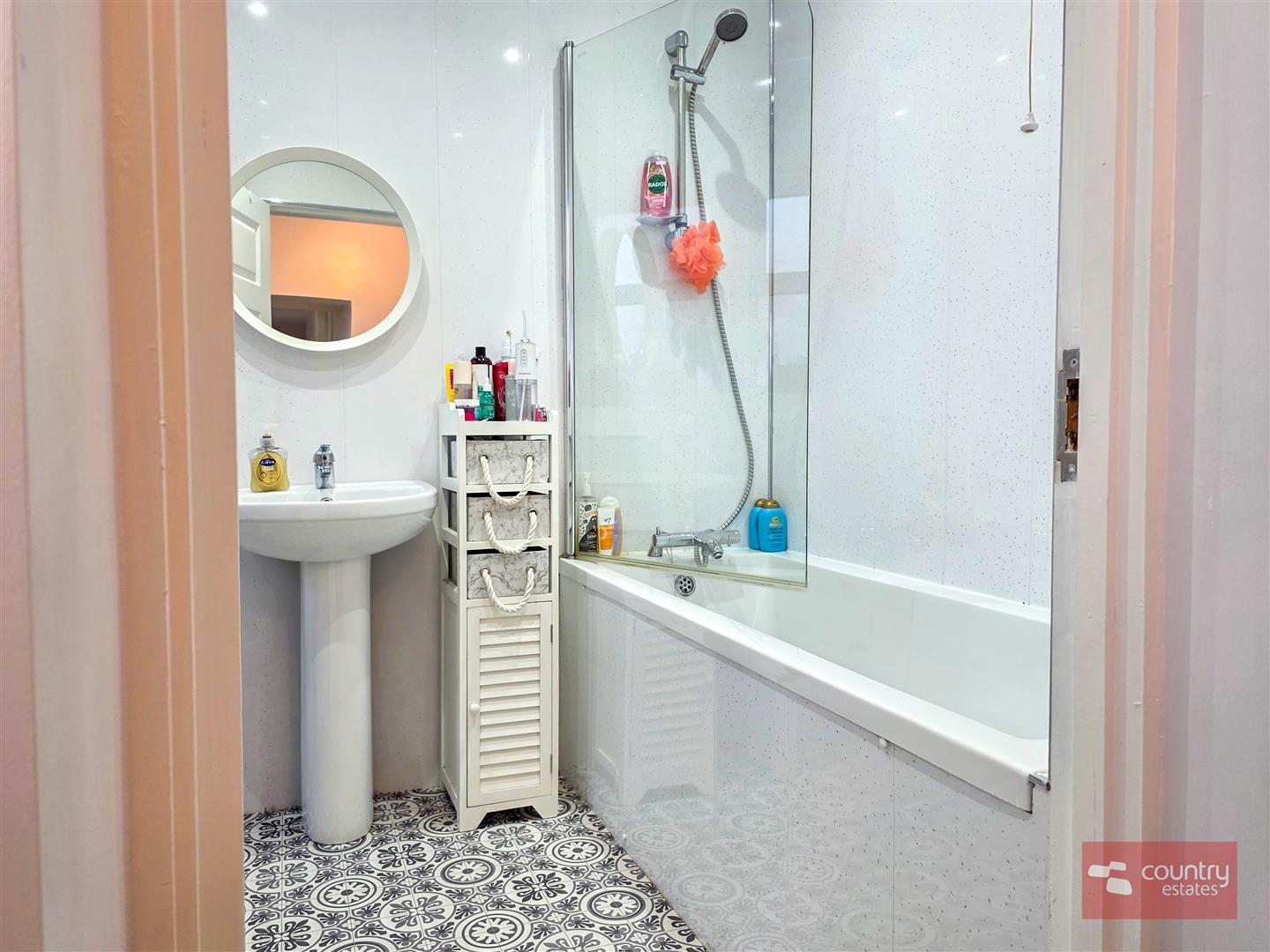 Comprising Panel bath with fixed shower screen and shower over, pedestal wash hand basin with monobloc tap and a button flush WC. PVC panelled walls. PVC panelled ceiling. Recessed down lighting. Chrome towel radiator.