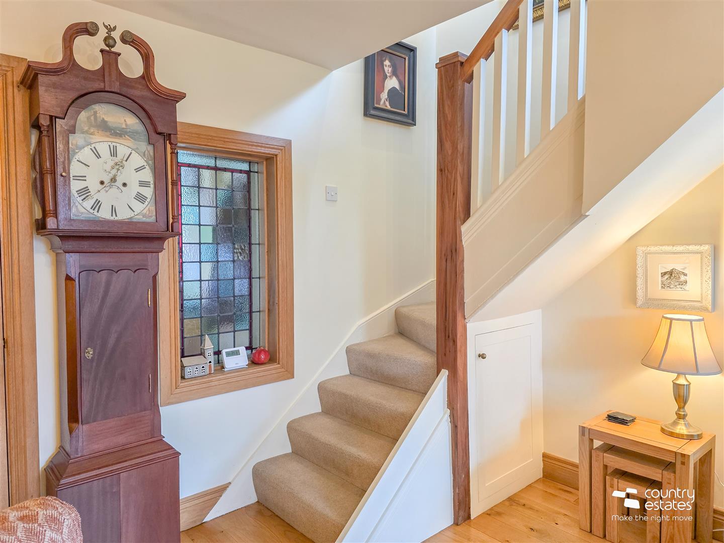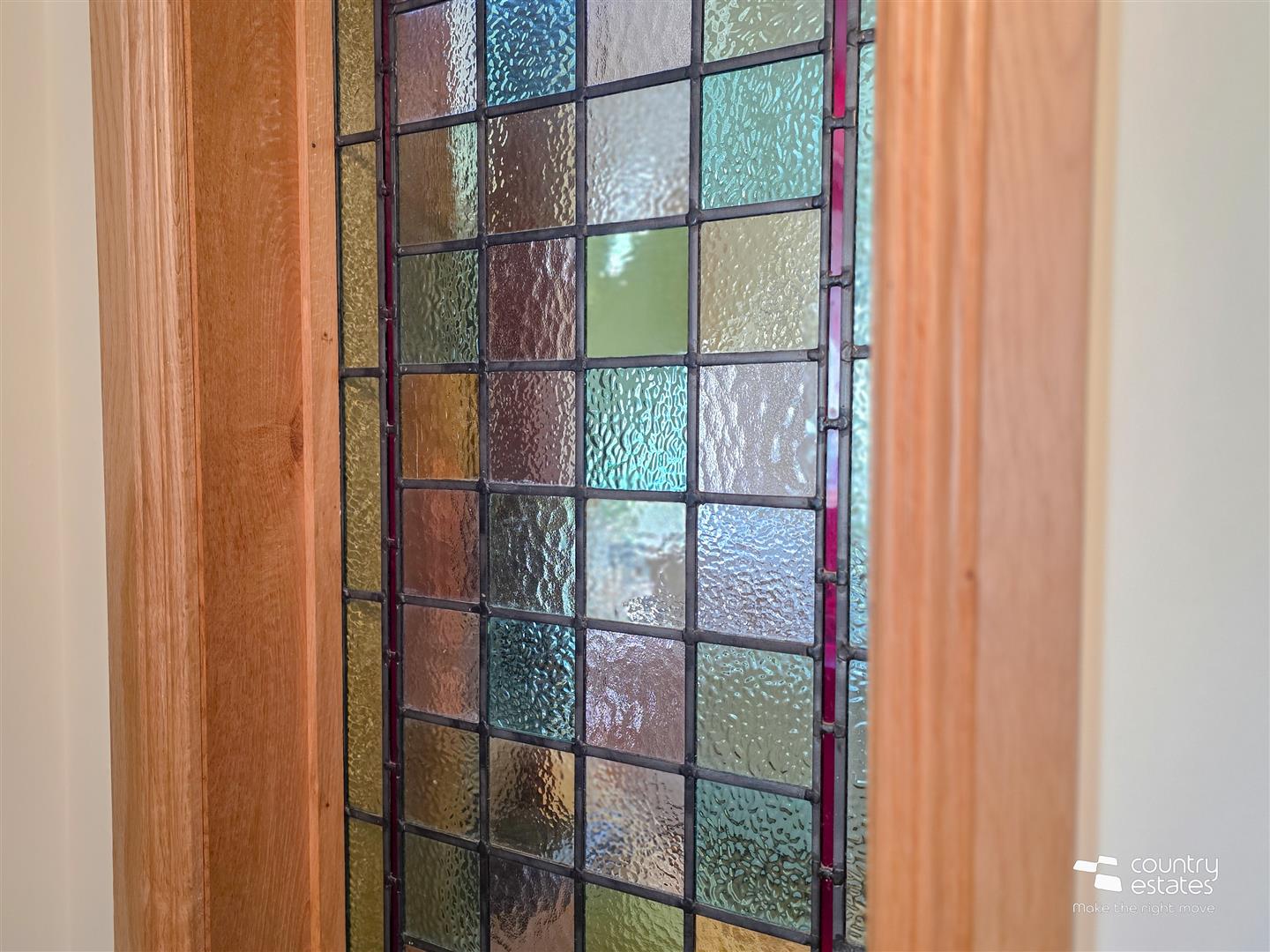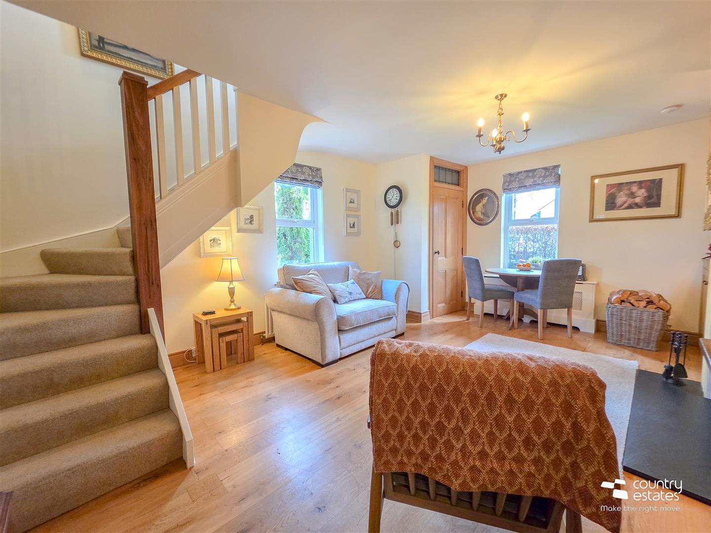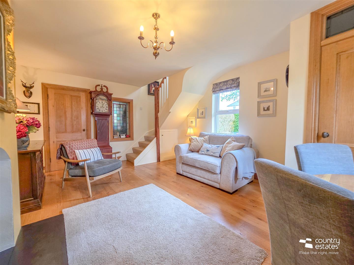Well presented lounge with attractive feature inglenook style fireplace and cast iron multifuel stove on a slate hearth. Feature stained glass window. Solid oak hard wood flooring. Stairs to first floor bedroom.