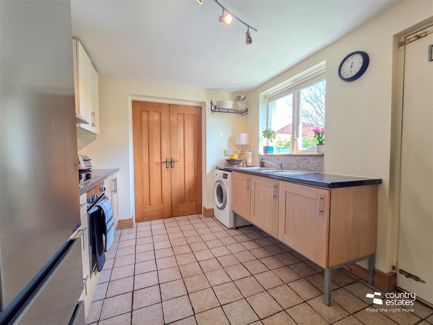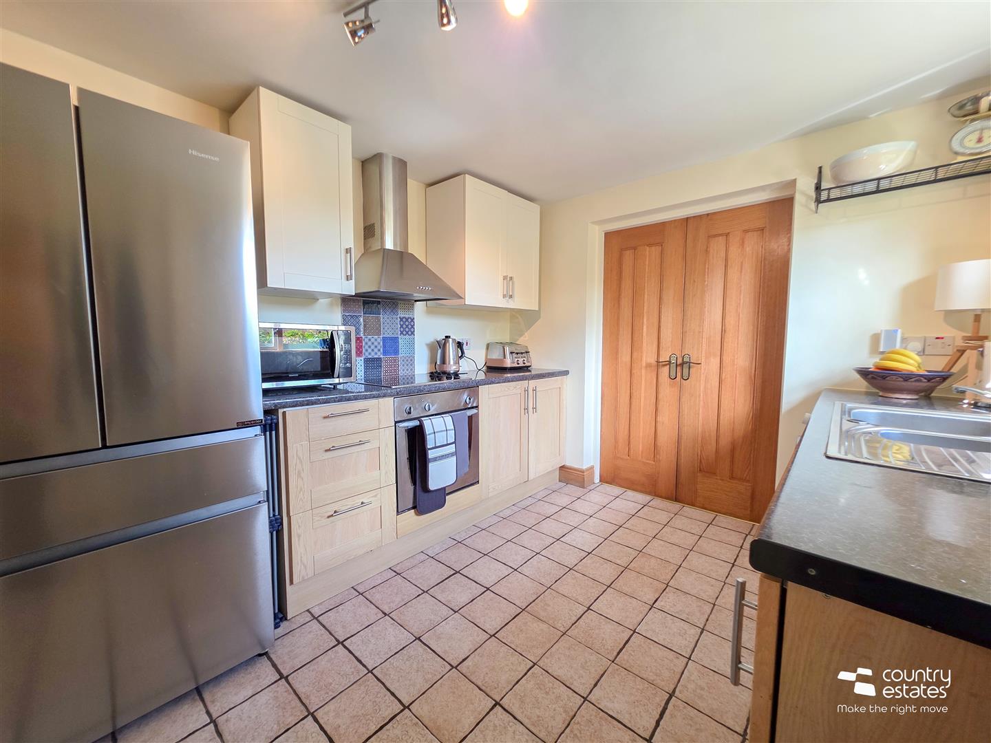 Equipped with a range of high and low level shaker style fitted units with contrasting work surfaces. One and a half bowl, single drainer, stainless steel sink unit with monobloc tap. Integrated oven with separate four ring electric hob, over head extractor fan housed in stainless steel canopy. Plumbed for washing machine. Space for free standing American style Fridge/freezer. Hard wood door to rear garden. Hard wood French doors into: