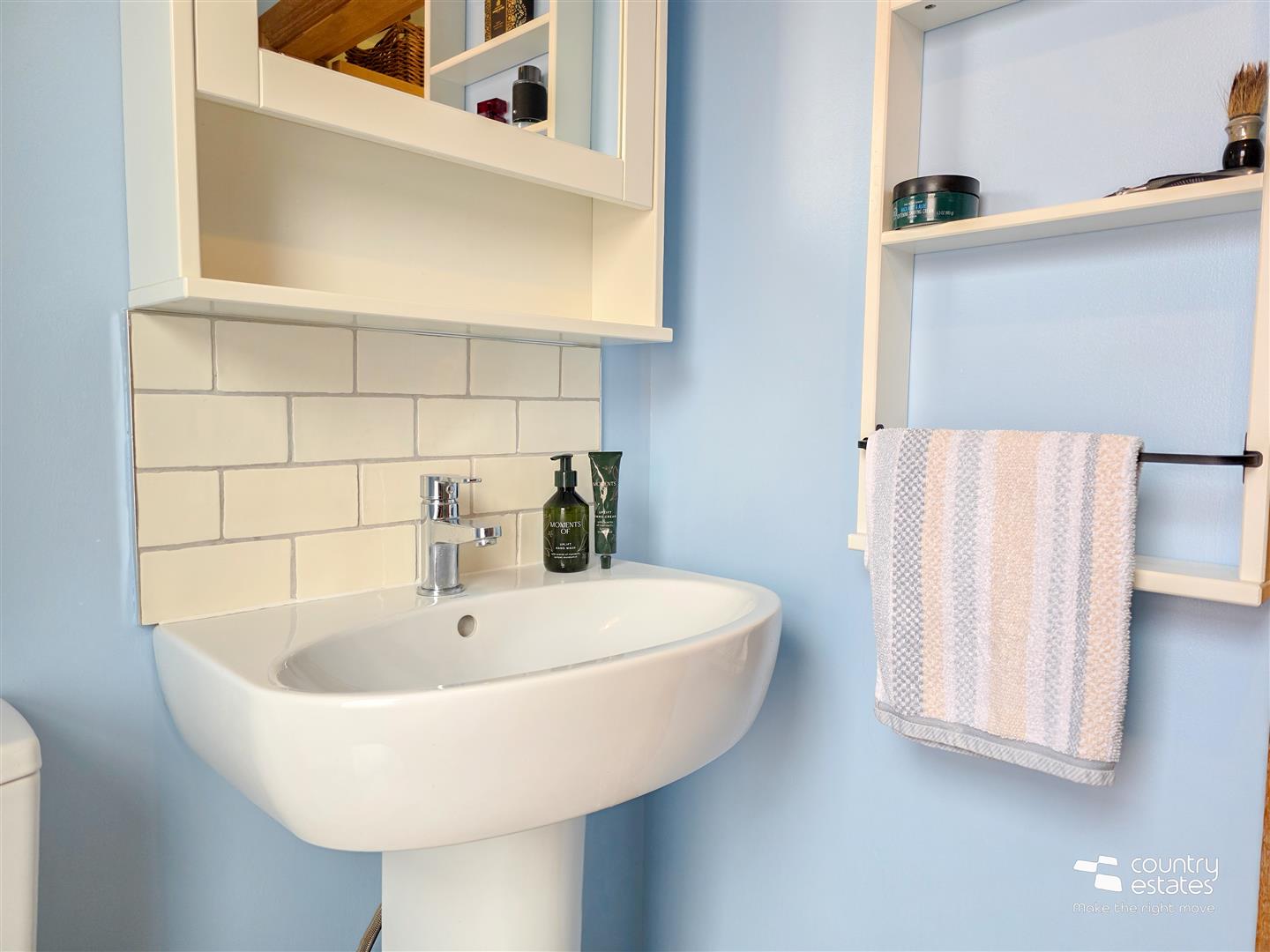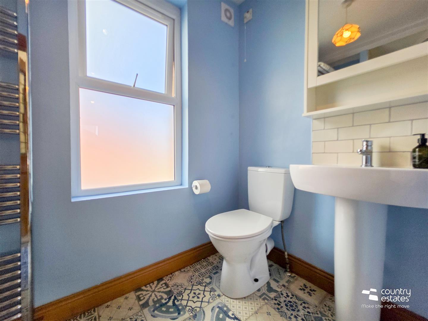 Comprising fully tiled shower cubicle with thermostatically controlled shower, pedestal wash hand basin and a low flush WC. Tiled splash back. Tiled floor.