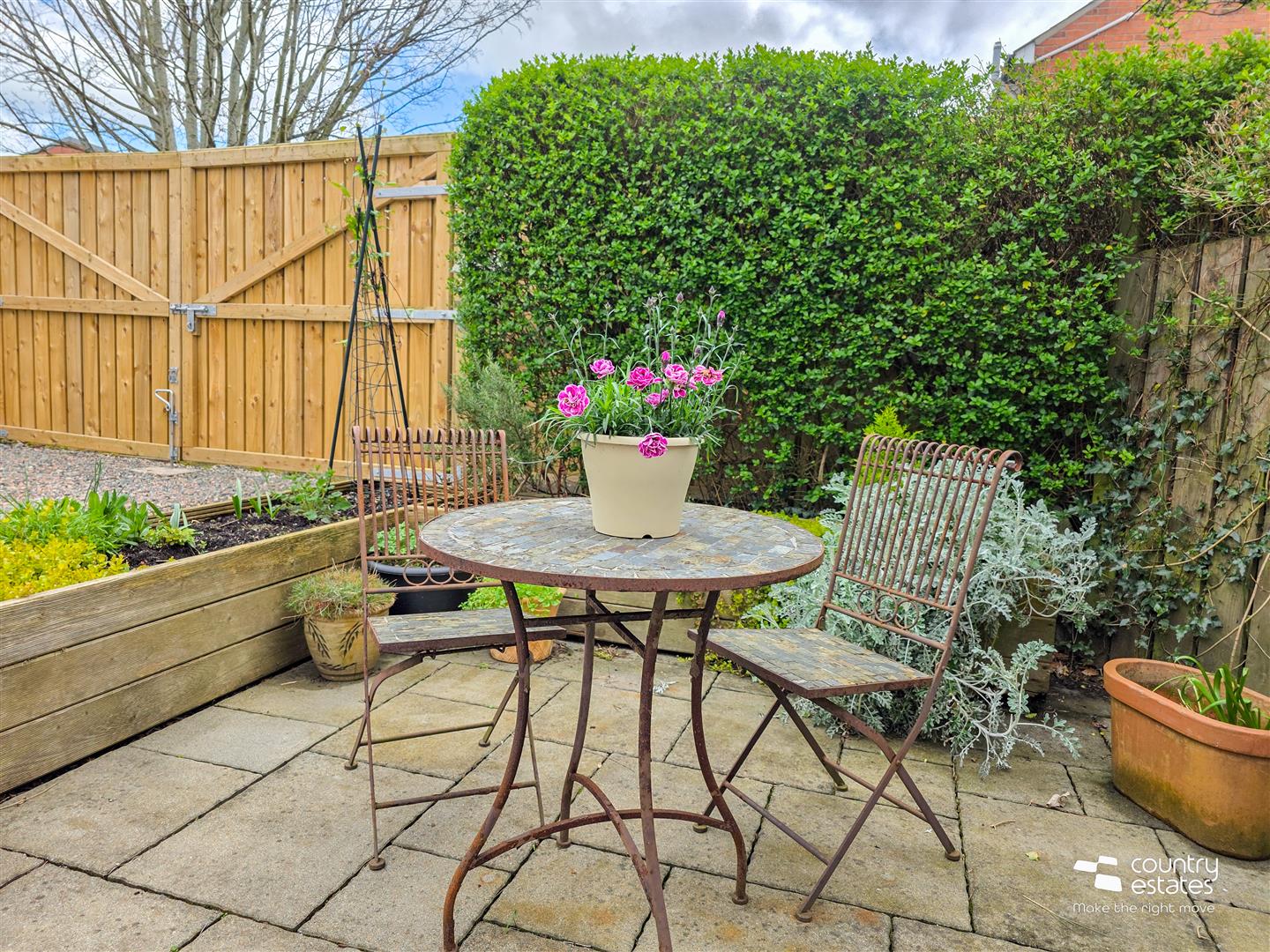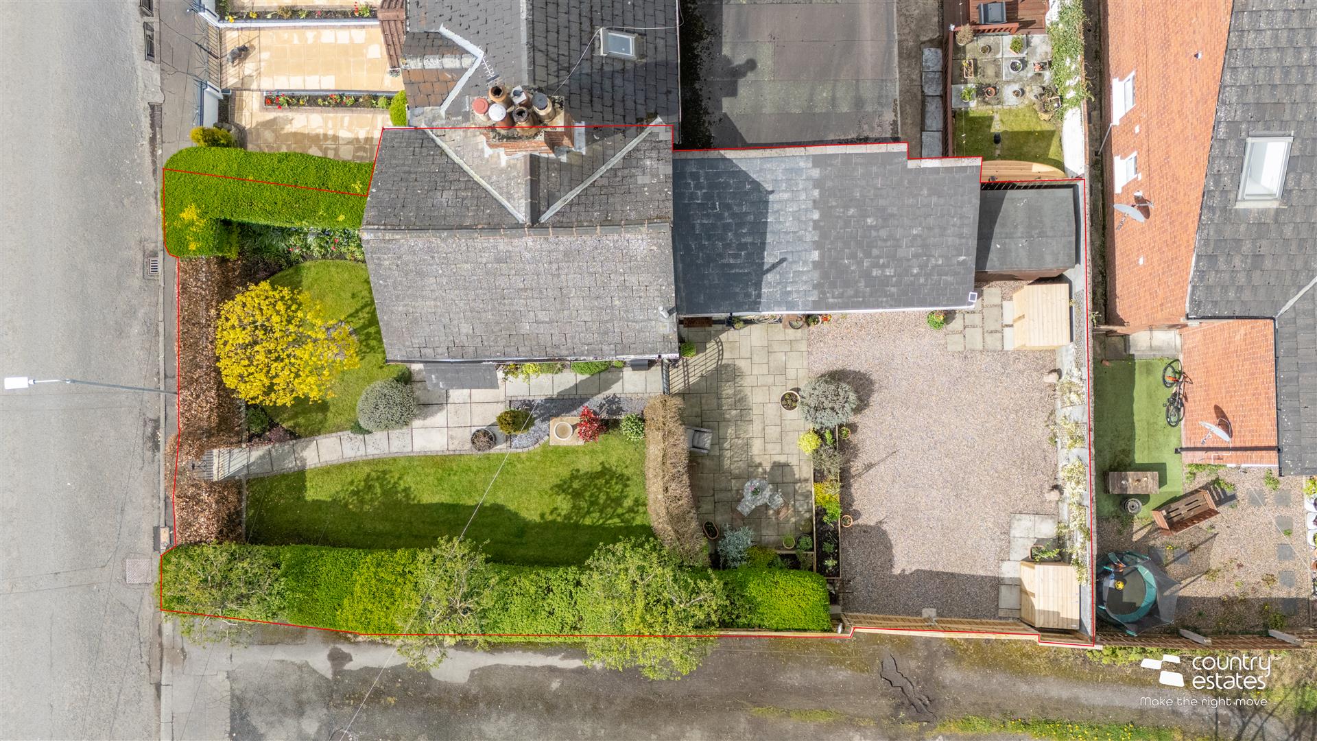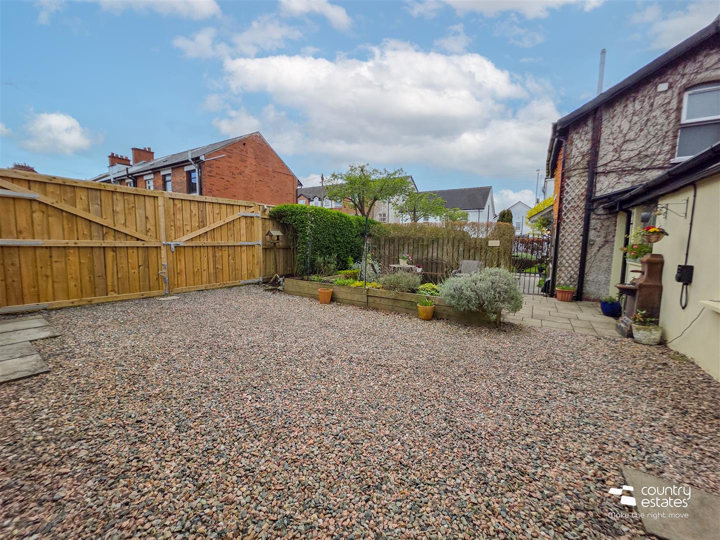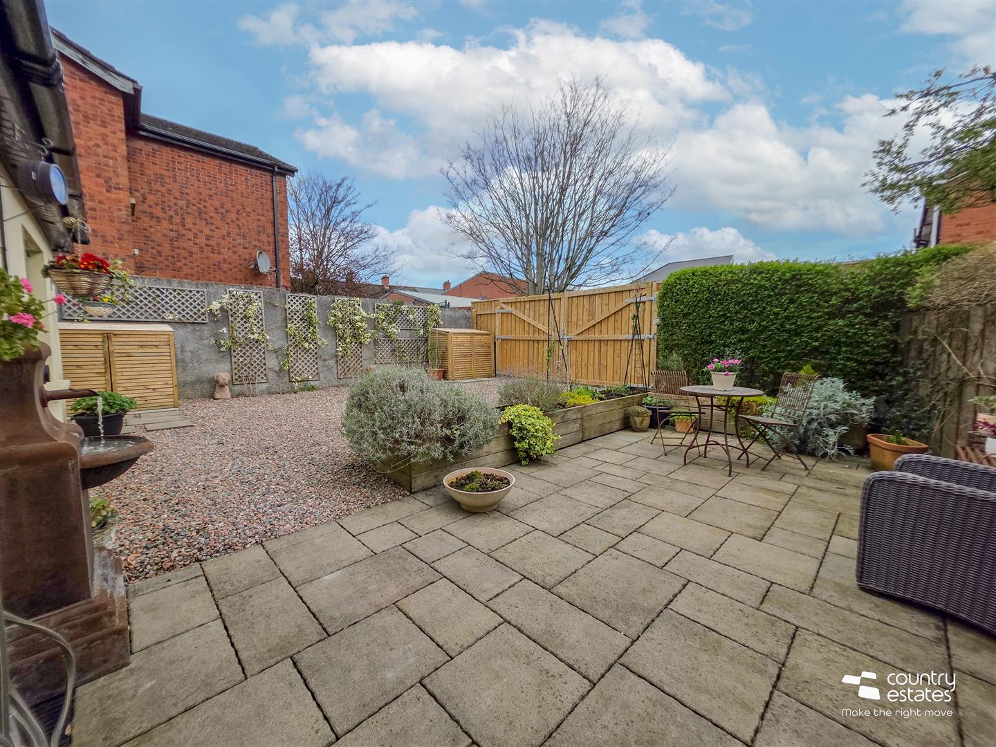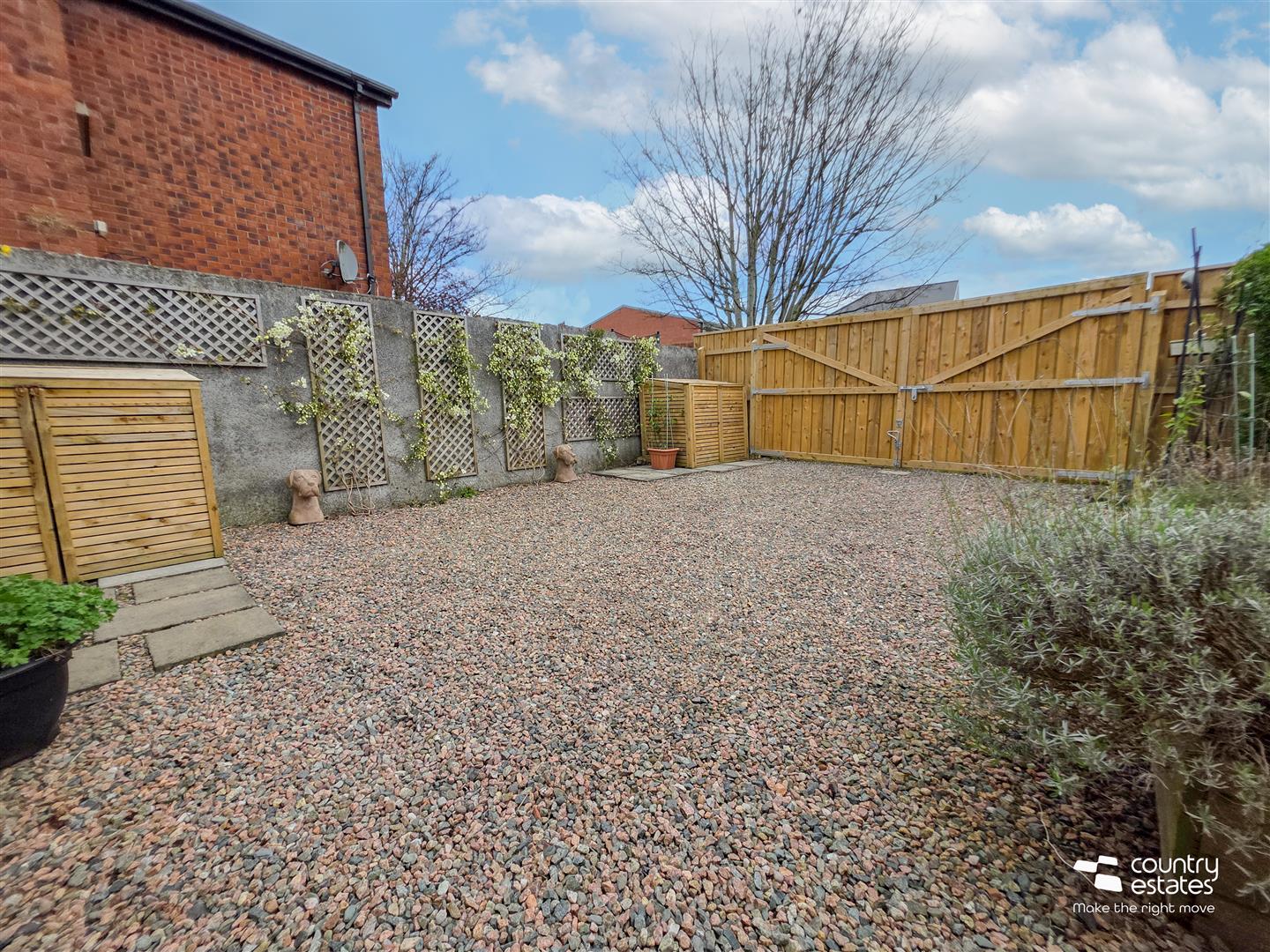 Access to private hard landscaped garden via gate. Paved patio area, perfect for family BBQ's. Pebbled driveway with EV charger, accessed via recently replaced twin gates. New wooden bin shed and wood shed. Garden shed for storage.