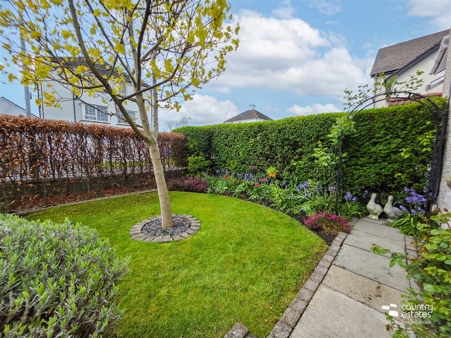 Beautifully maintained gardens to front, laid in lawn. Stocked with a variety of mature shrubs and screened by mature hedgerow. Paved walkways.
