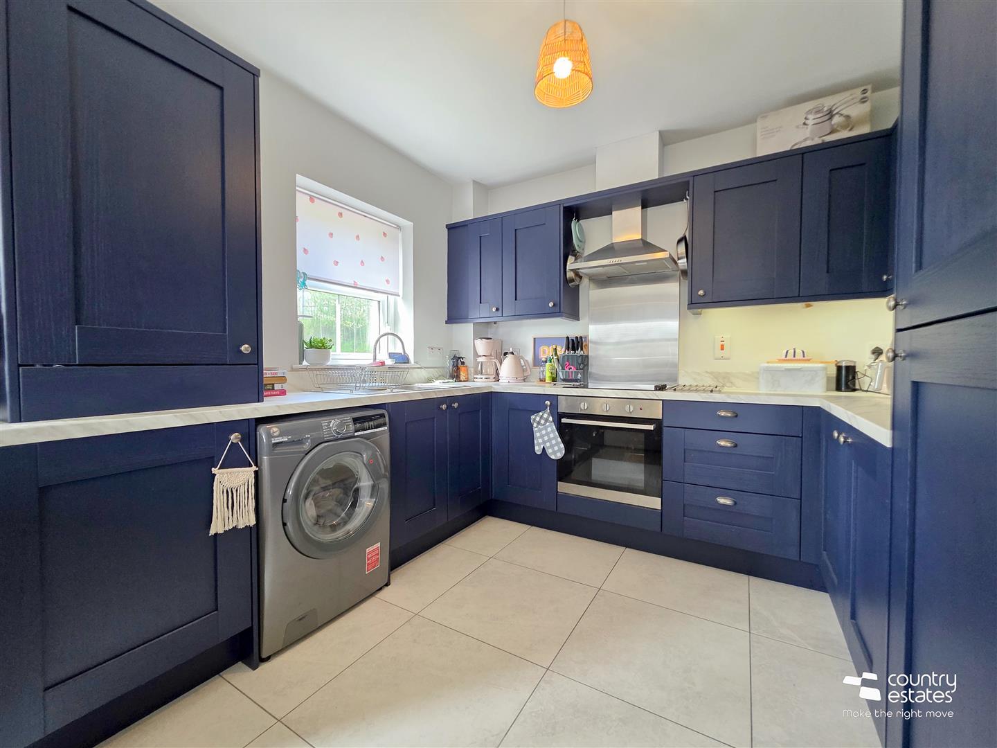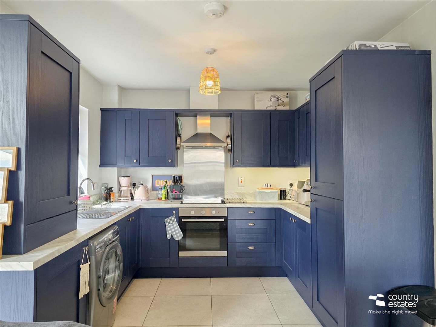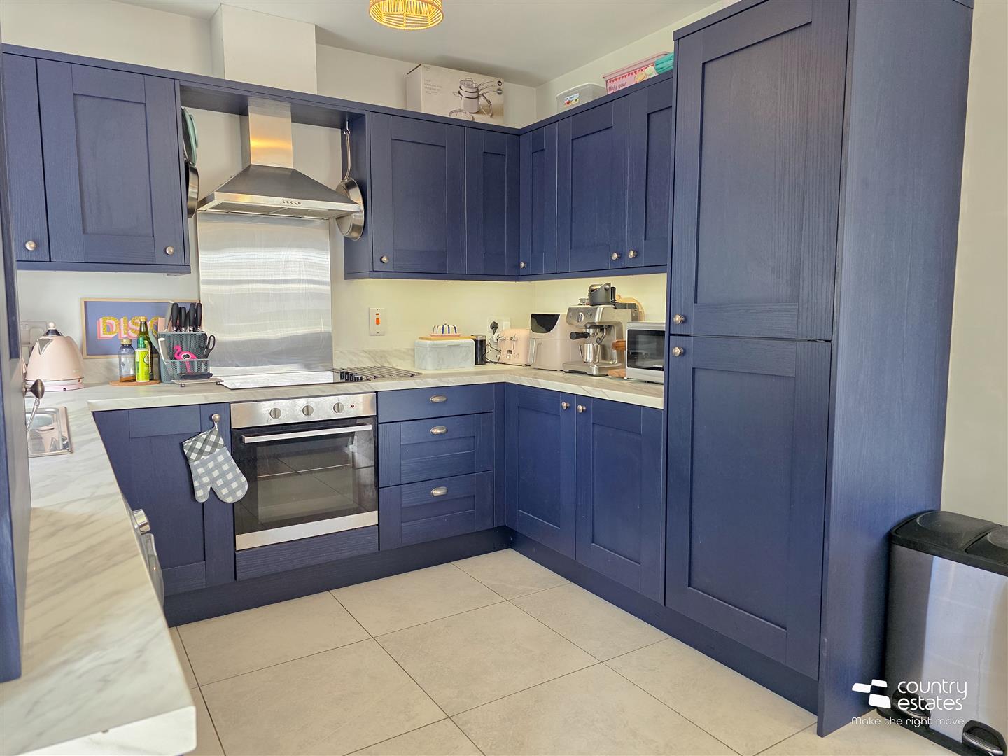 Modern shaker style kitchen equipped with a comprehensive range of high and low level fitted units in royal blue finish with contrasting work surfaces and upstands. Single drainer stainless steel sink unit with swan neck tap. Integrated oven with separate four ring electric hob and overhead extractor fan housed in stainless steel canopy. Integrated Fridge/Freezer. Plumbed for washing machine. Tiled floor.