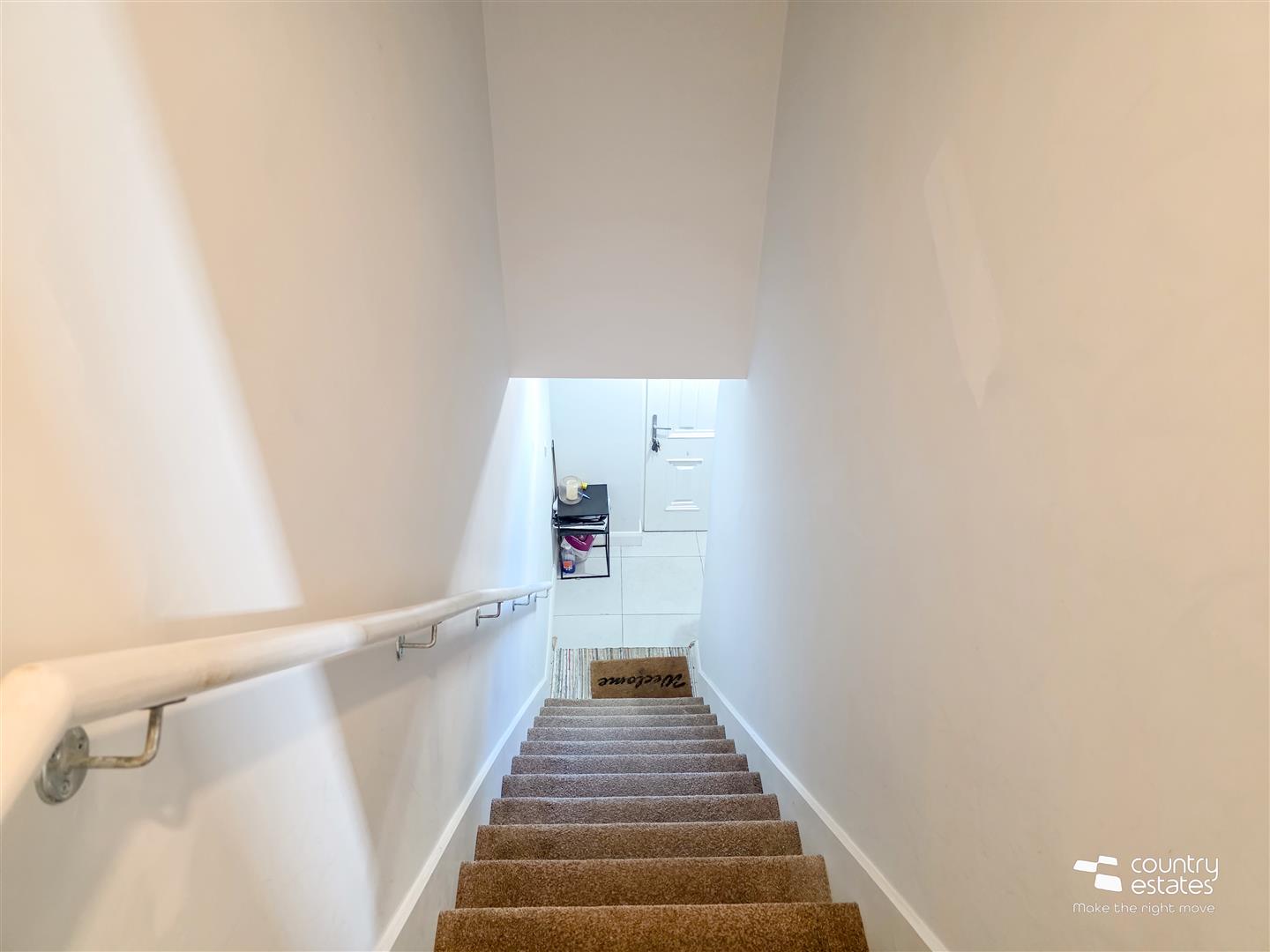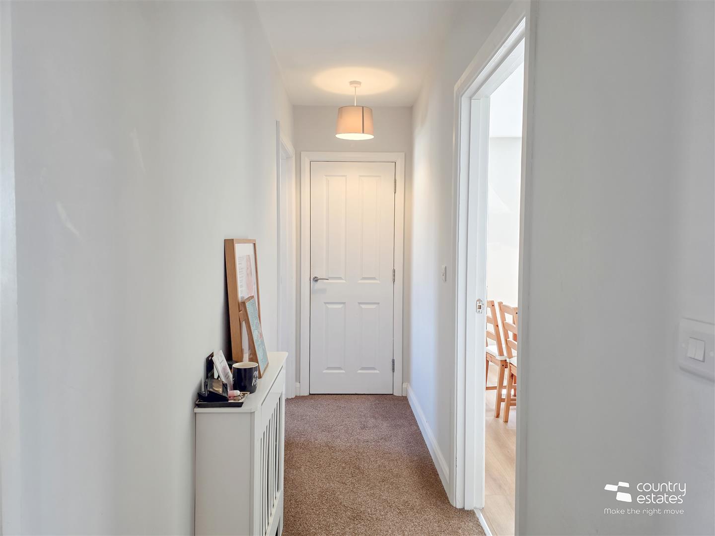 Private composite front door with fan light into entrance hall. Tiled floor. Stairs to landing. Access to roof space. Built in storage cupboard.
