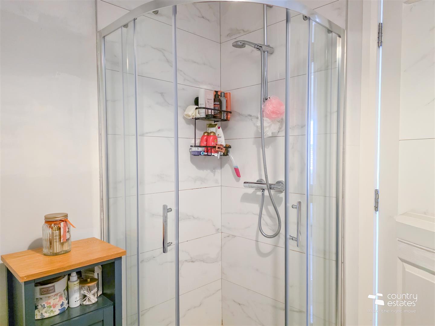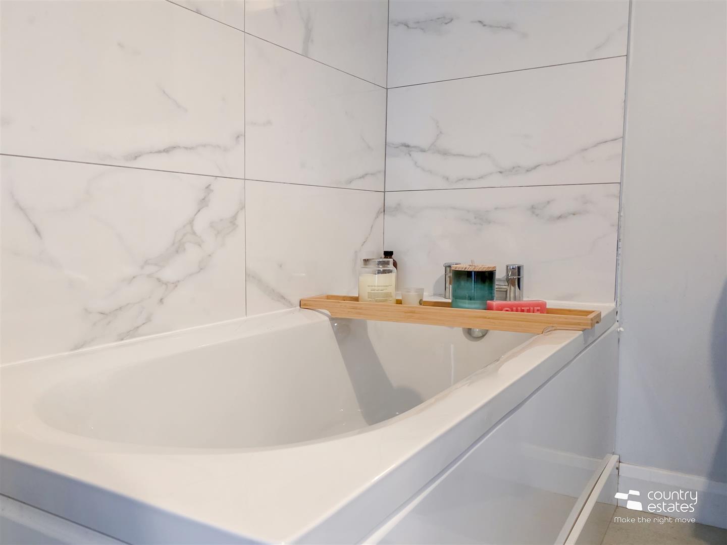 Comprising panel bath, fully tiled quadrant shower cubicle with thermostatically controlled shower, pedestal wash hand basin with monobloc tap and a button flush WC. Part tiled walls. Tiled floor.