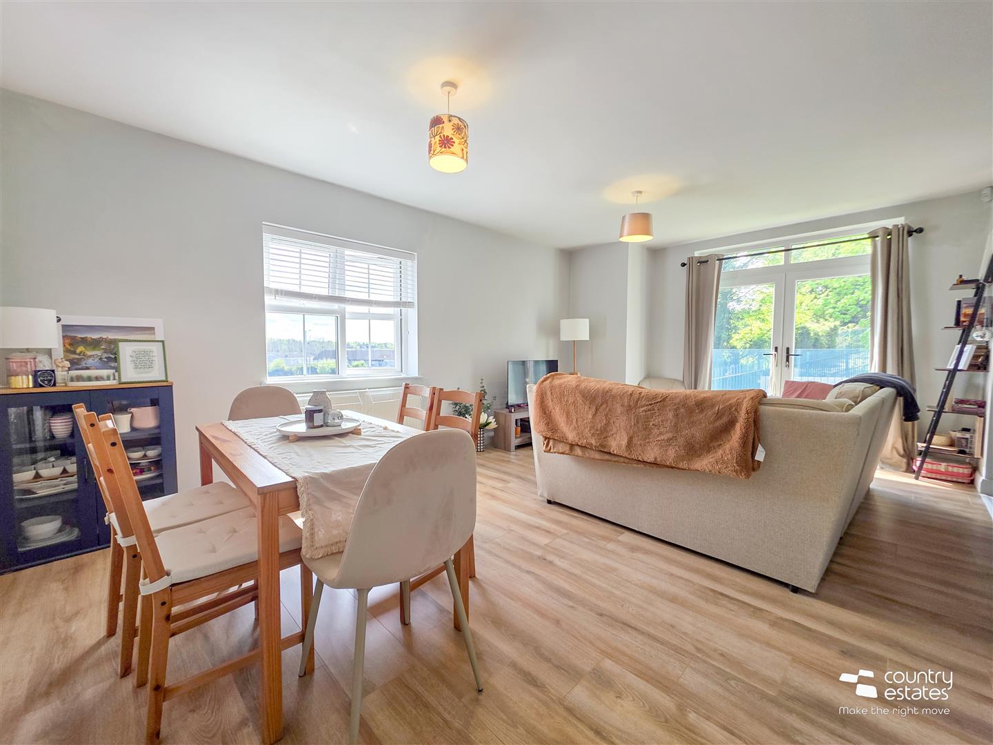 Spacious lounge with quality laminate flooring. PVC Double glazed French doors open to Juliet balcony with Glass balustrade.
