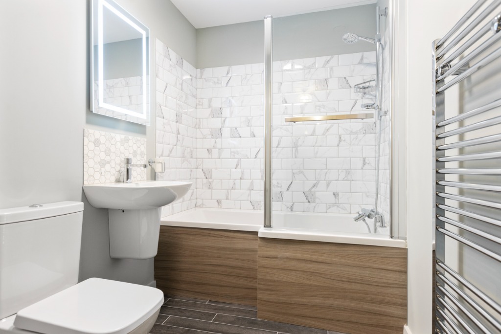 ~ White bath with integrated bath fill and wall mounted concealed shower and bath mixer