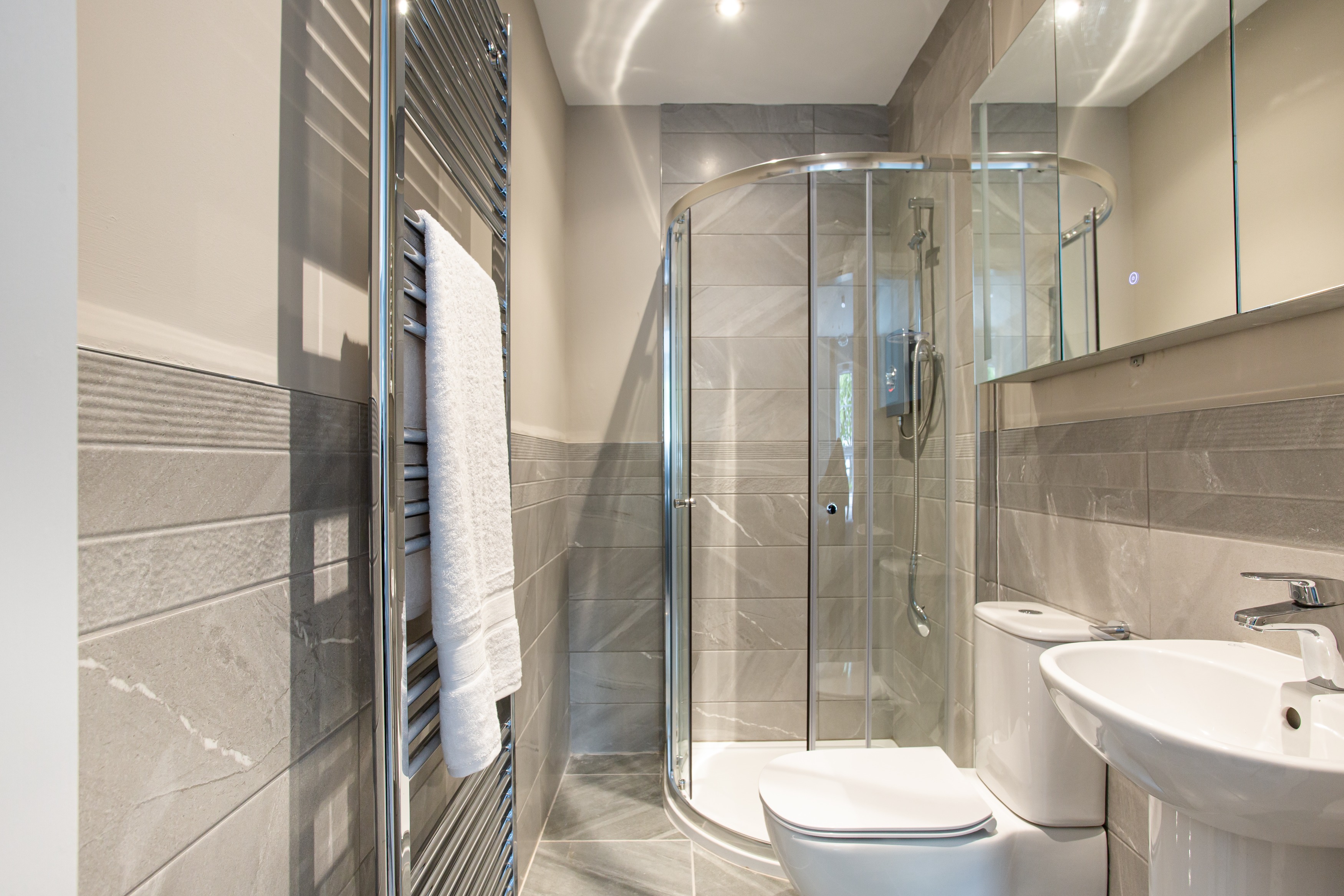 The apartments come with gas heating and accent a dove grey painted kitchen offering both elegance and practicality, concealing an integrated fridge freezer, microwave and dishwasher. This space is finished with a white quartz splash back and worktop which extends to the breakfast bar complete with luxurious mid grey quilted bar stools.