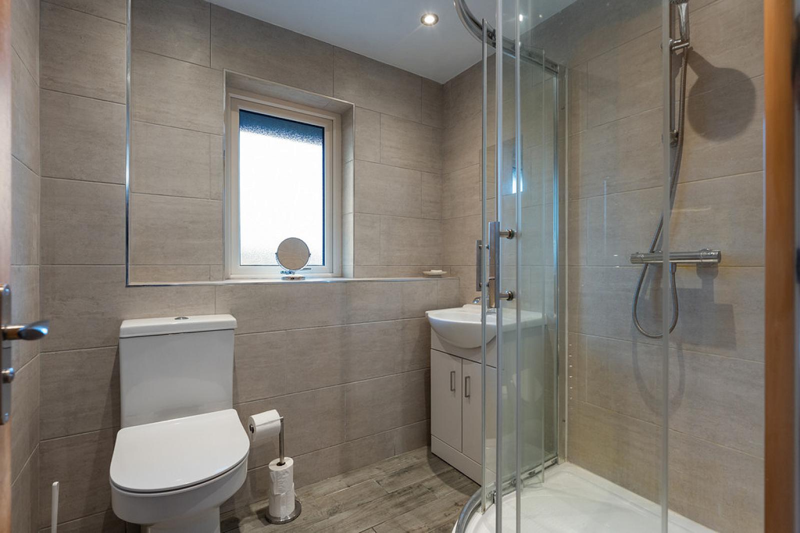SHOWER ROOM Enclosed shower cubicle, low flush WC, vanity wash hand basin, tiled walls, tiled floor, stainless steel towel radiator, recessed low voltage spotlights, extractor fan.