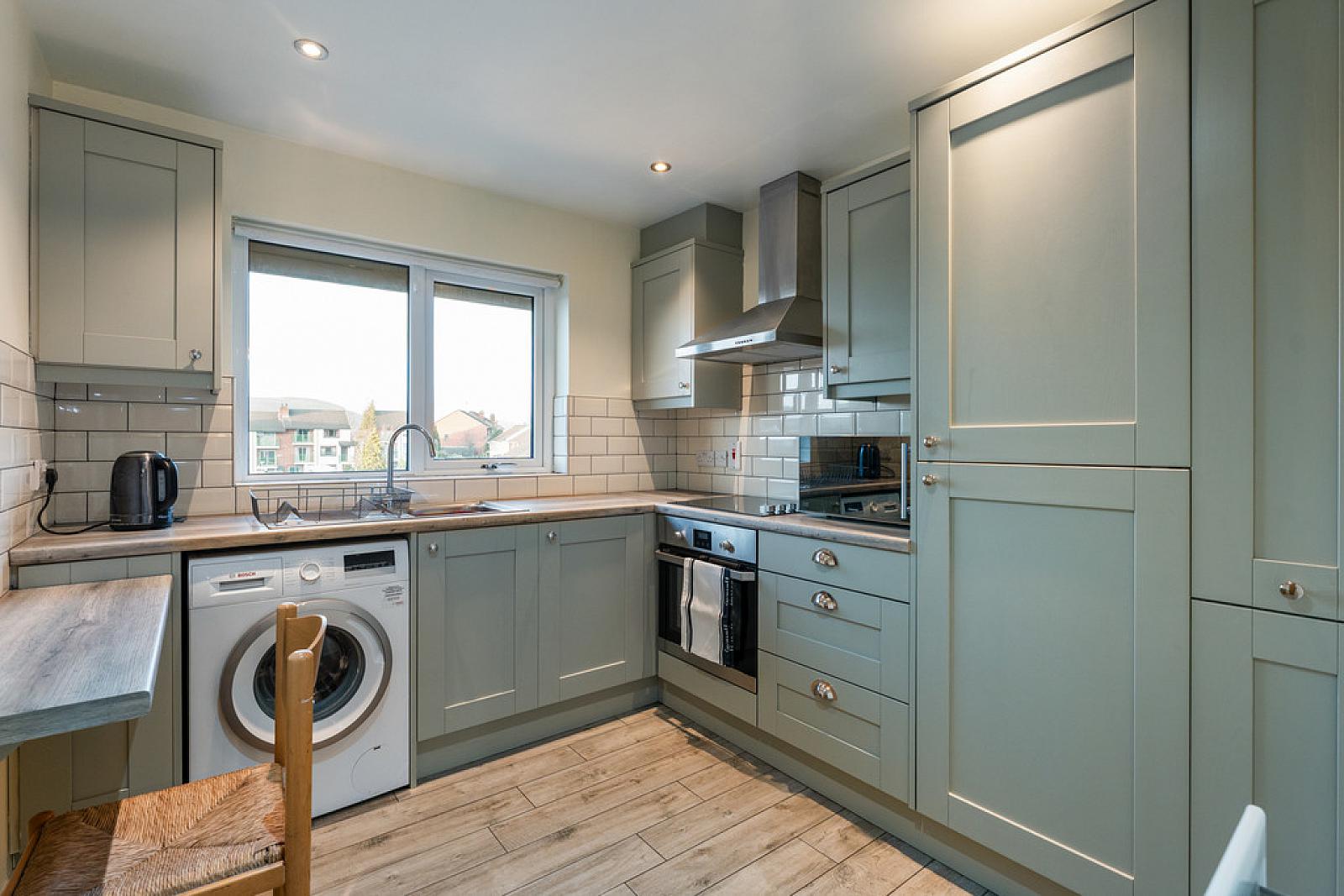 The layout includes a bright and generous lounge that opens into a modern fitted kitchen with a casual breakfast area. There are two well-proportioned double bedrooms and a contemporary shower room with a white suite. A particularly appealing feature is the apartment's own private front door, complemented by a sheltered balcony seating area, which is perfect for relaxing. Residents' parking adds further convenience.