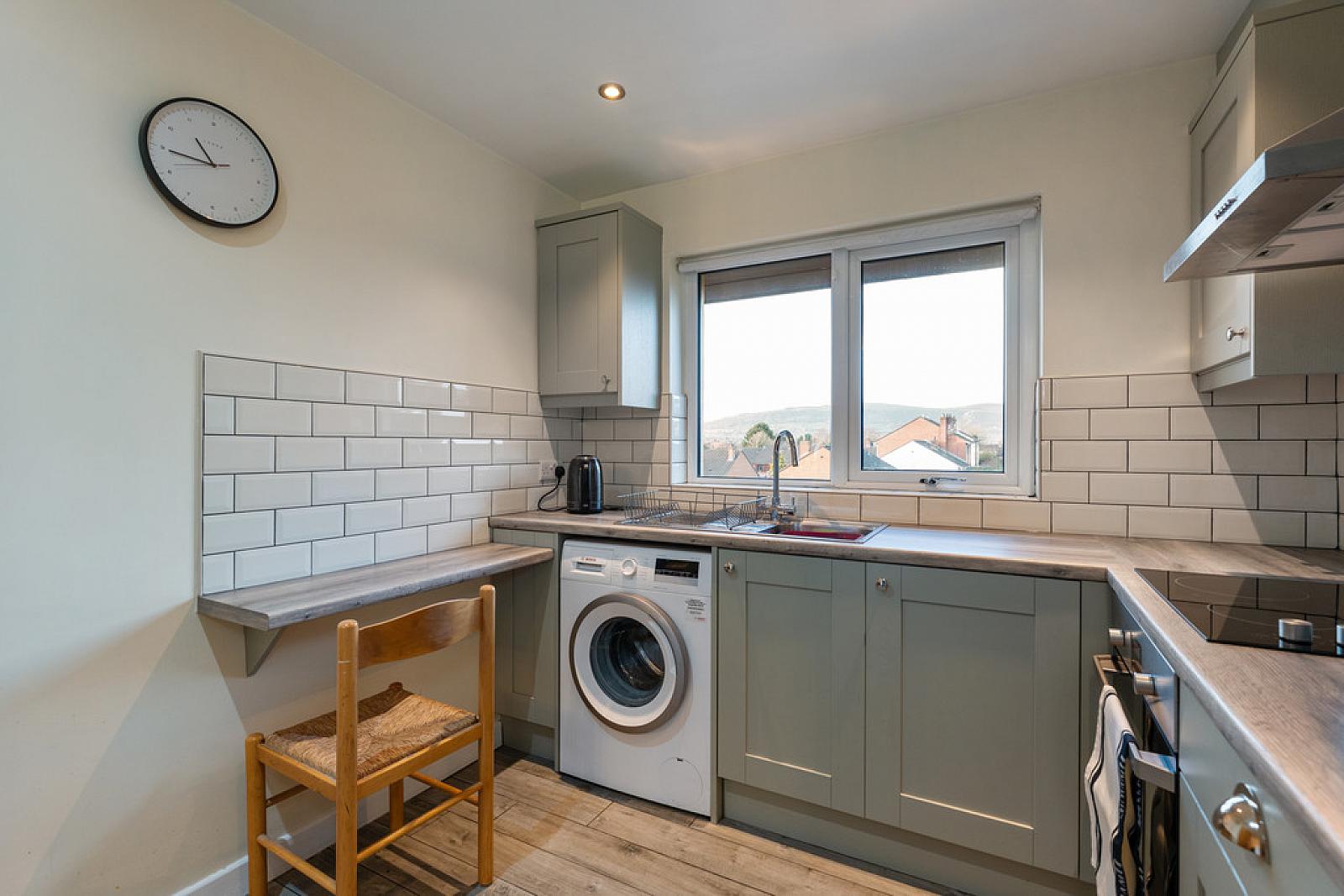 KITCHEN WITH BREAKFAST AREA 9' 1" x 8' 4" (2.77m x 2.55m) Range of fitted high and low level units, single drainer stainless steel sink unit with mixer taps, plumbed for washing machine, integrated electric hob, integrated oven, integrated fridge and freezer, stainless steel extractor fan, tiled floor, tiled splash back, recessed low voltage spotlights.