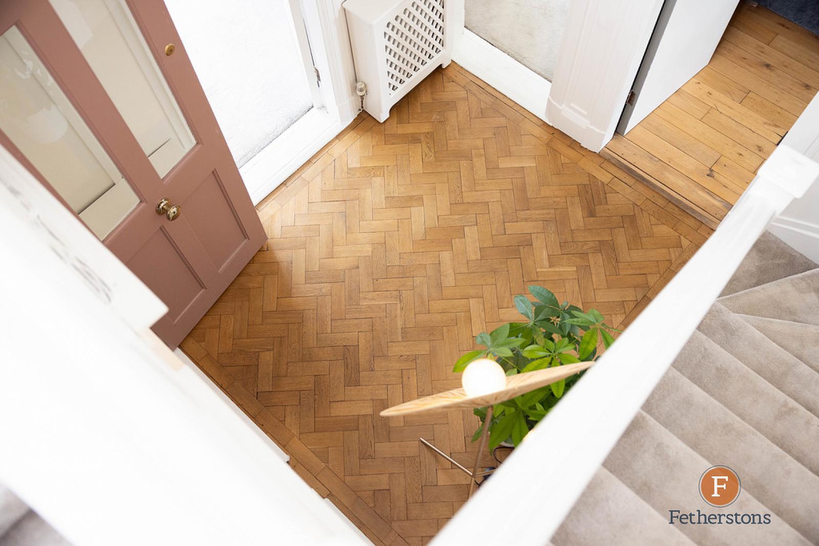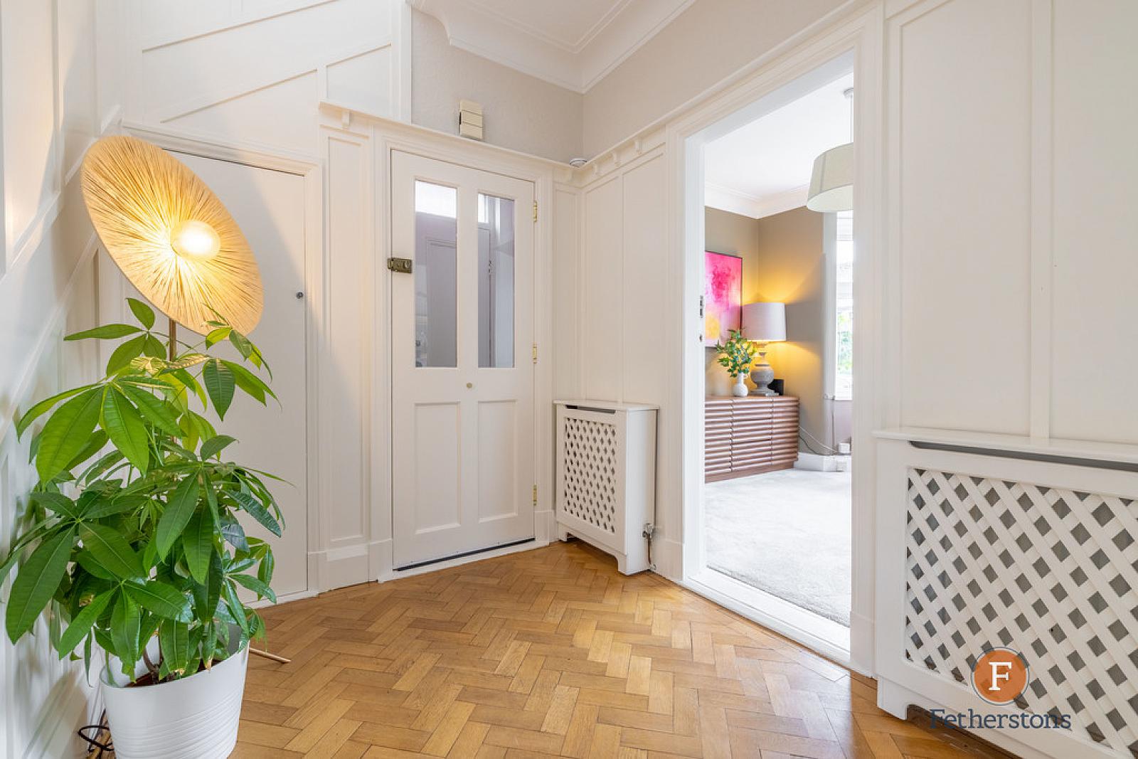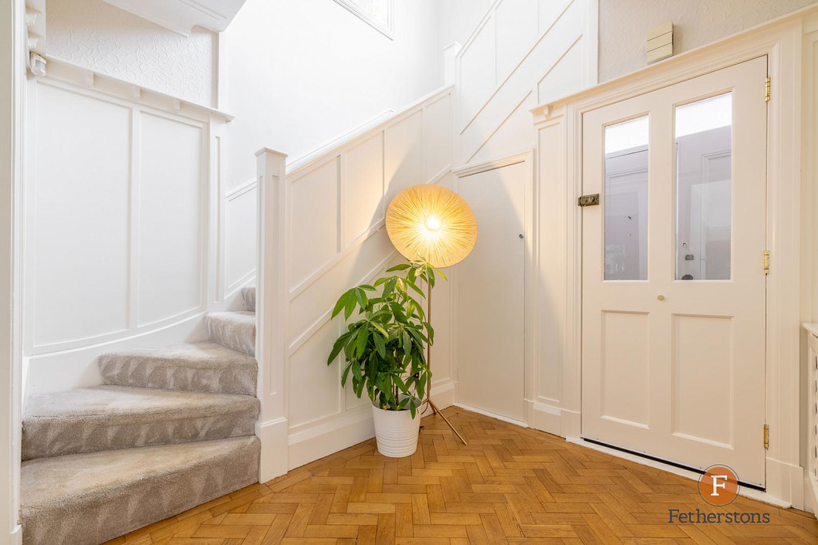 RECEPTION HALL Stairs to first floor. Parquet wood block flooring. Wood panelled walls. Understairs storage cupboard.