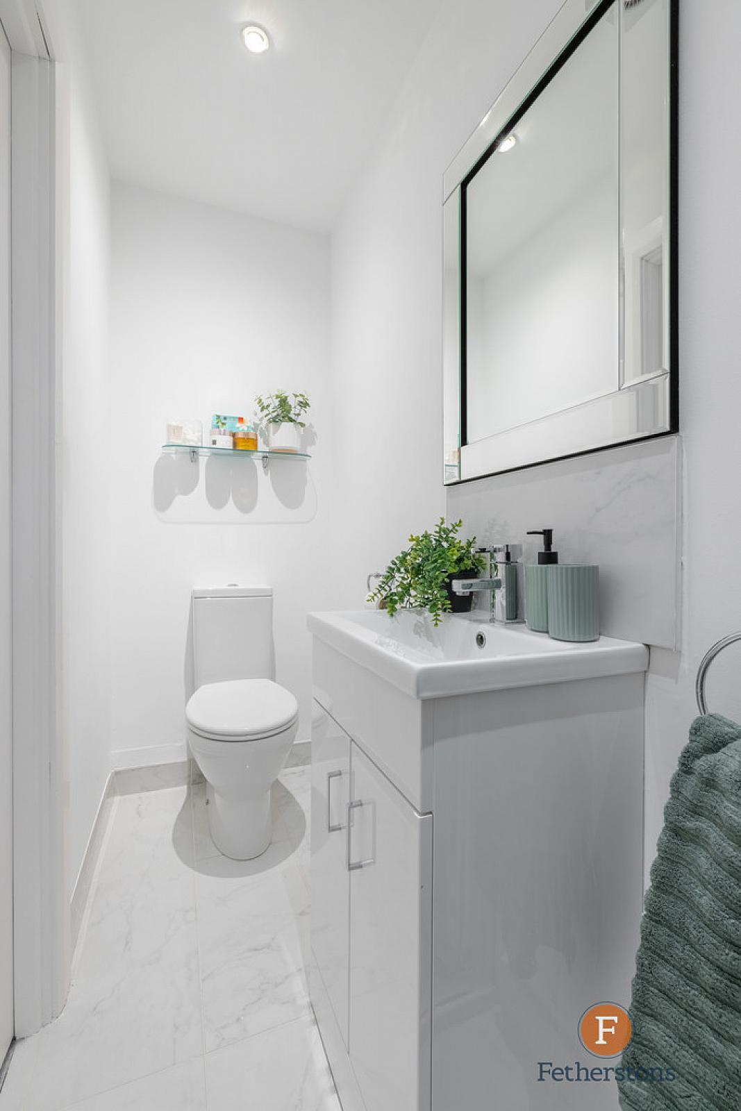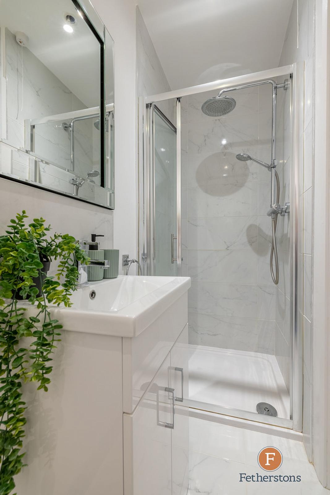 ENSUITE White suite comprising of a low flush wc, vanity wash hand basin, tiled splashback, fully tiled shower cubicle with rainwater shower head, tiled floor, low voltage spotlights, extractor fan.