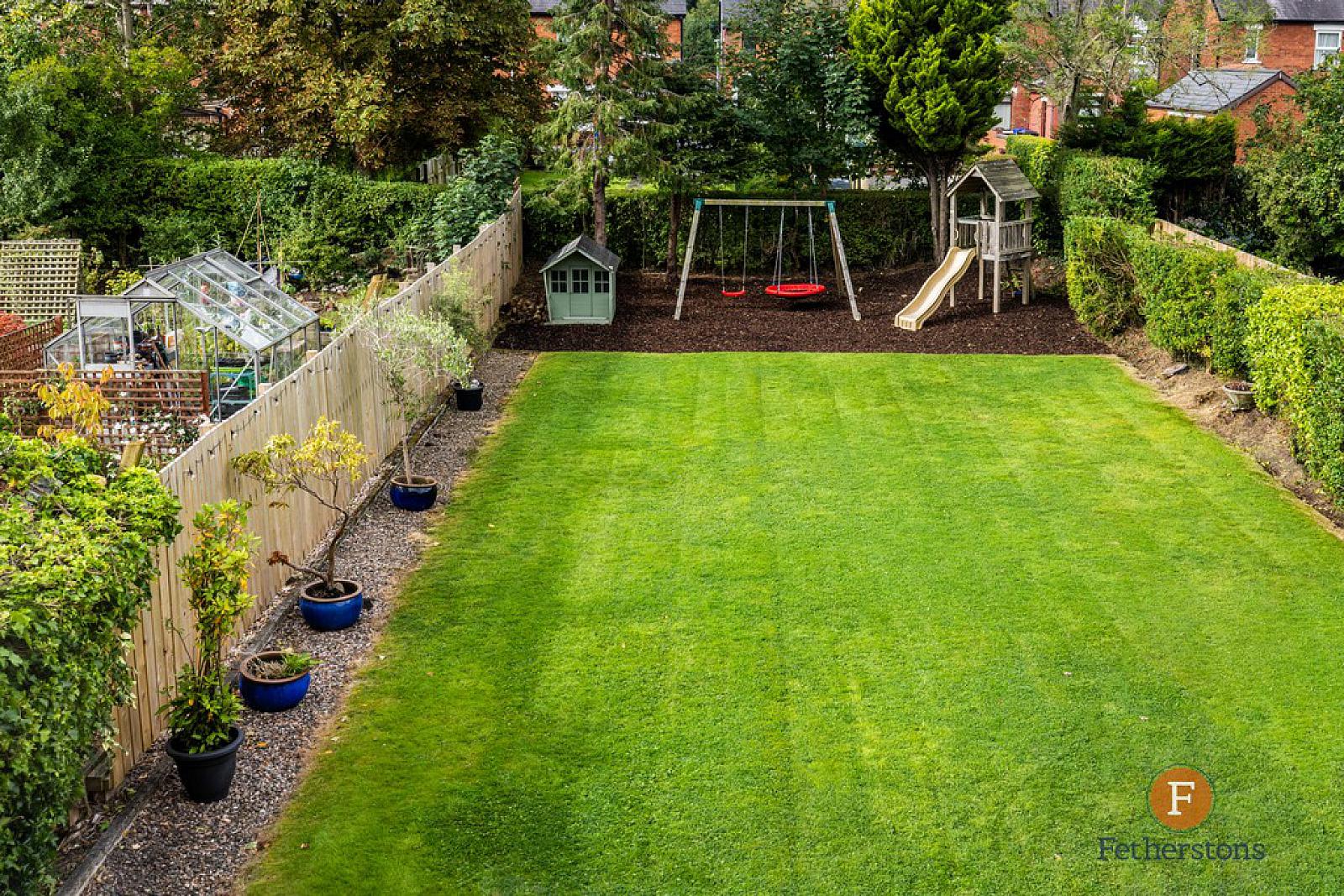 South-facing garden with lawn and play area