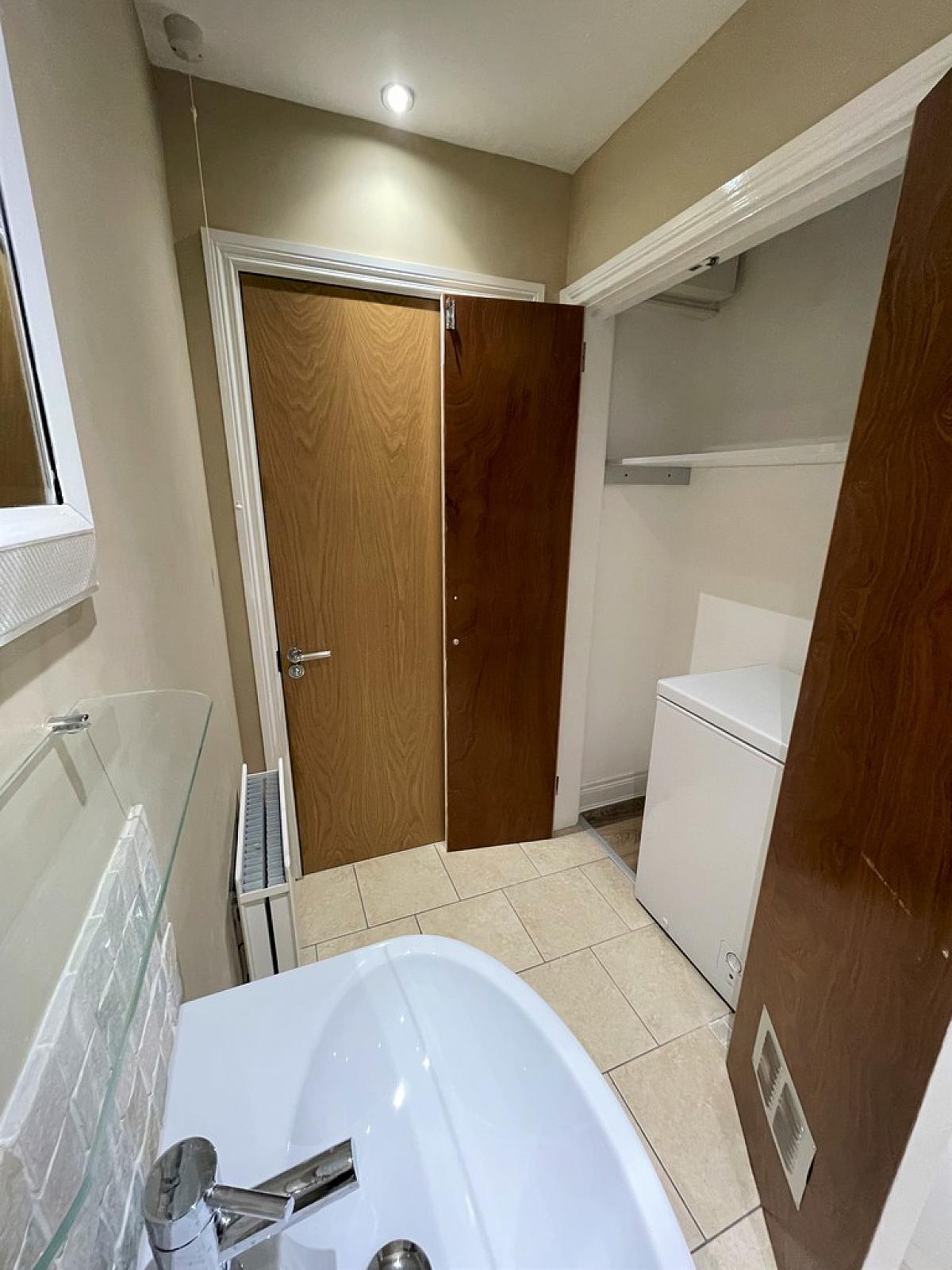 Contemporary Bathroom With Three Piece Suite And Storage Cupboard Containing Freezer