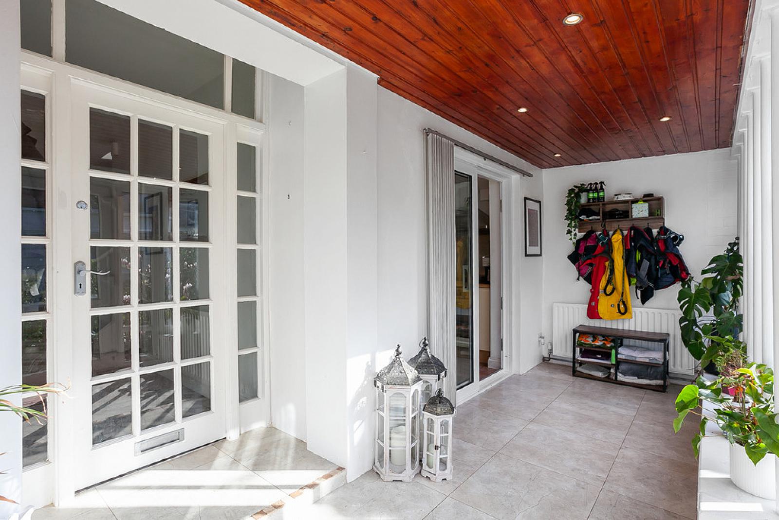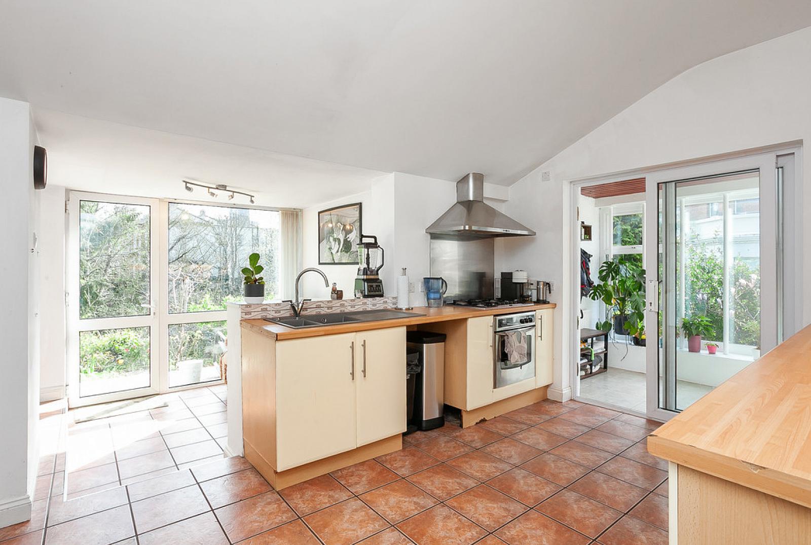 ENTRANCE SUN PORCH 15' 5" x 5' 6" (4.7m x 1.68m) Tiled floor, tongue and groove ceiling with low voltage spots, uPVC double glazed sliding door to kitchen, glazed door to entrance hall.