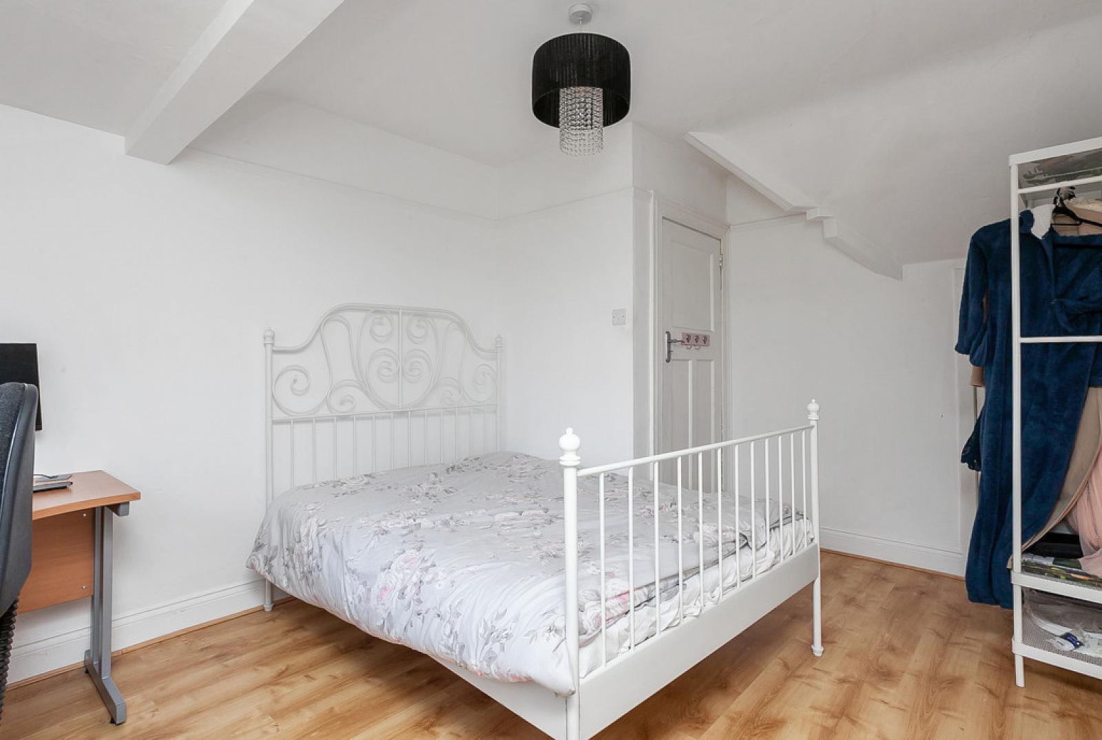 BEDROOM 14' 0" x 9' 11" (4.27m x 3.02m) Laminate wood effect floor, built in storage, access to attic
