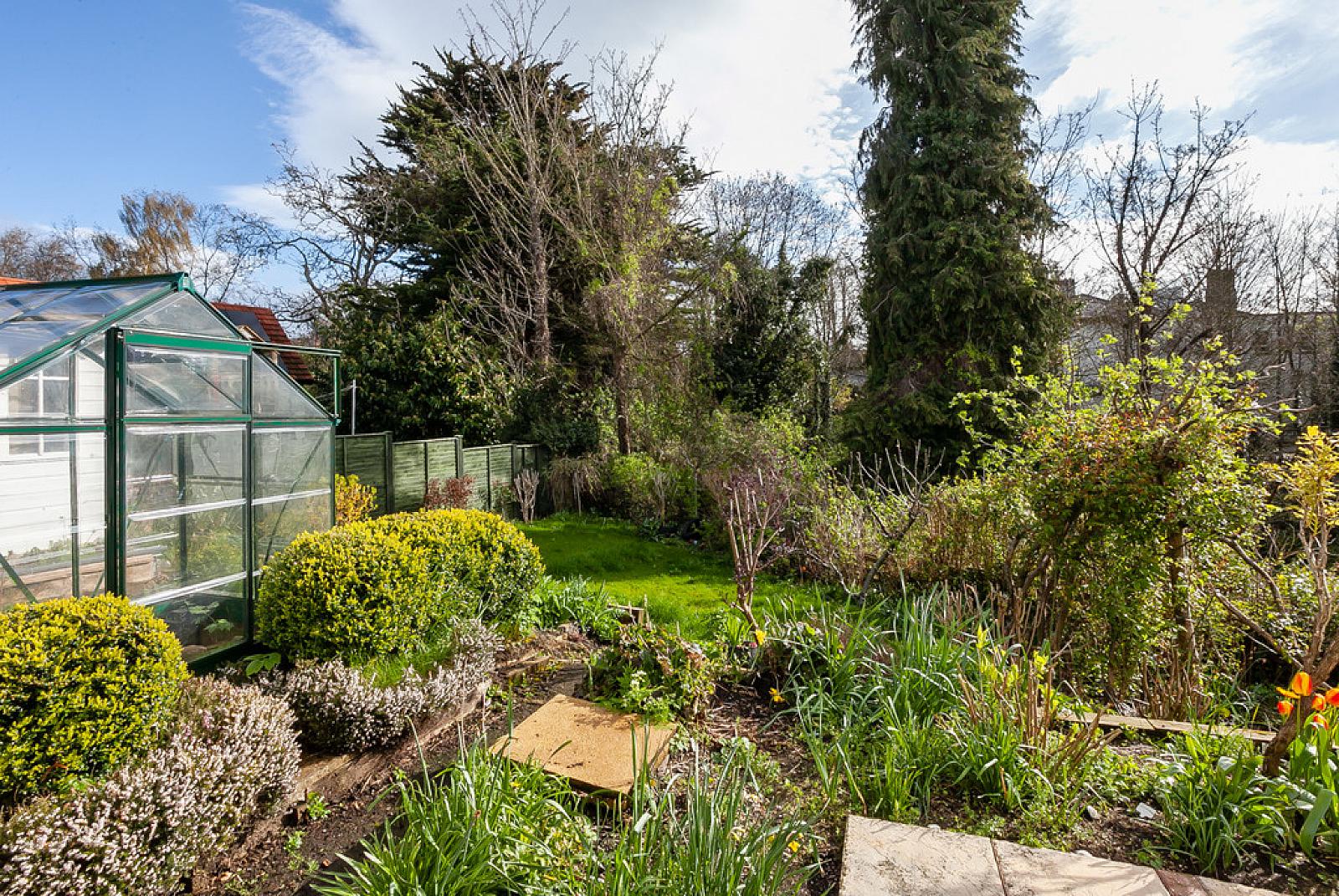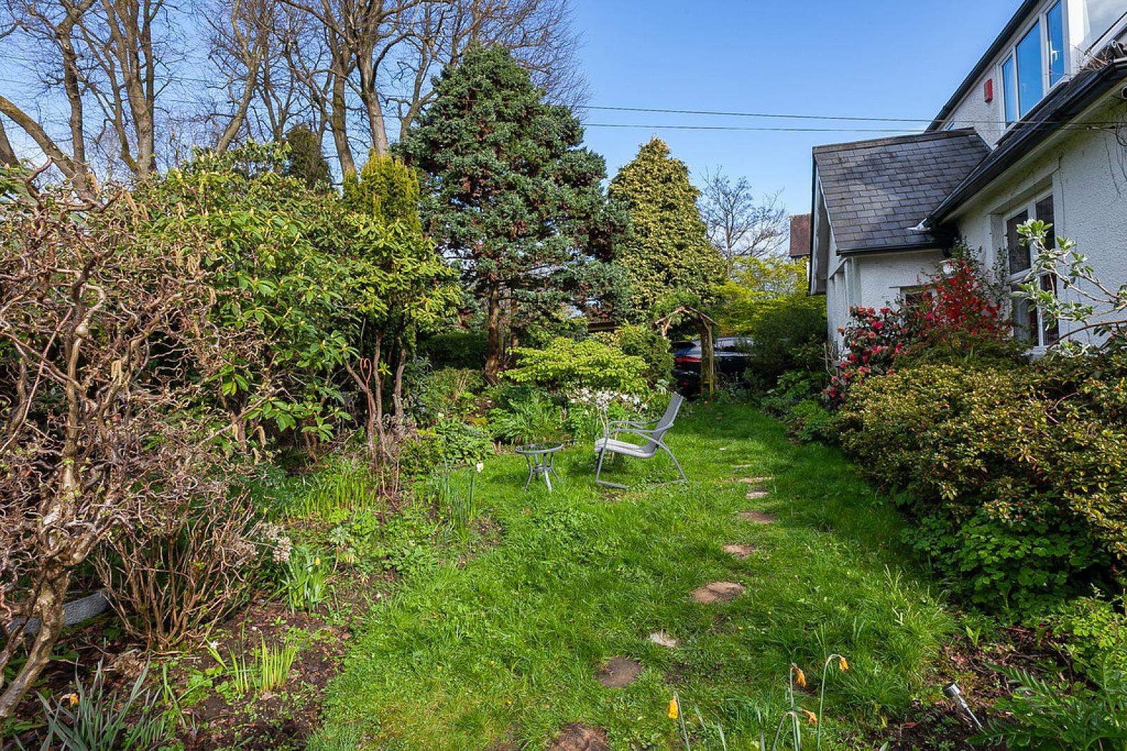 OUTSIDE Gardens in trees, shrubs and herbaceous planting. Dual access via driveway and pedestrian path. Rear gardens backing on to mature trees and green space. Outside taps and lights. Ample parking