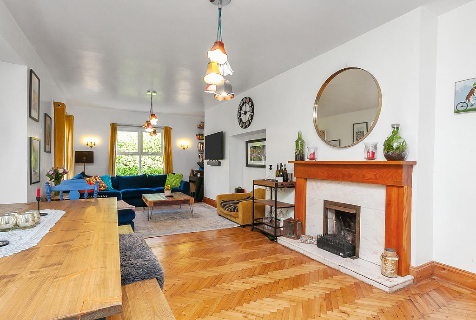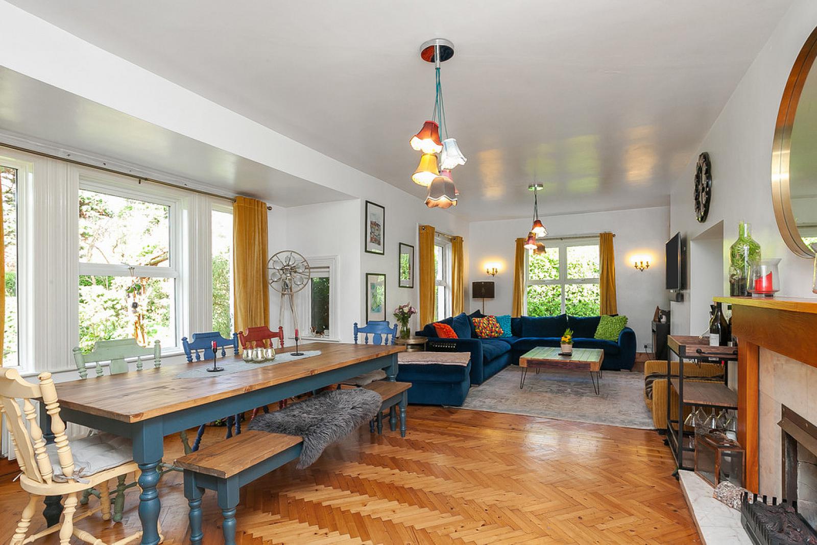 LOUNGE WITH DINING AREA 29' 8" x 16' 6" (9.04m x 5.03m) Original parquet wood block floor