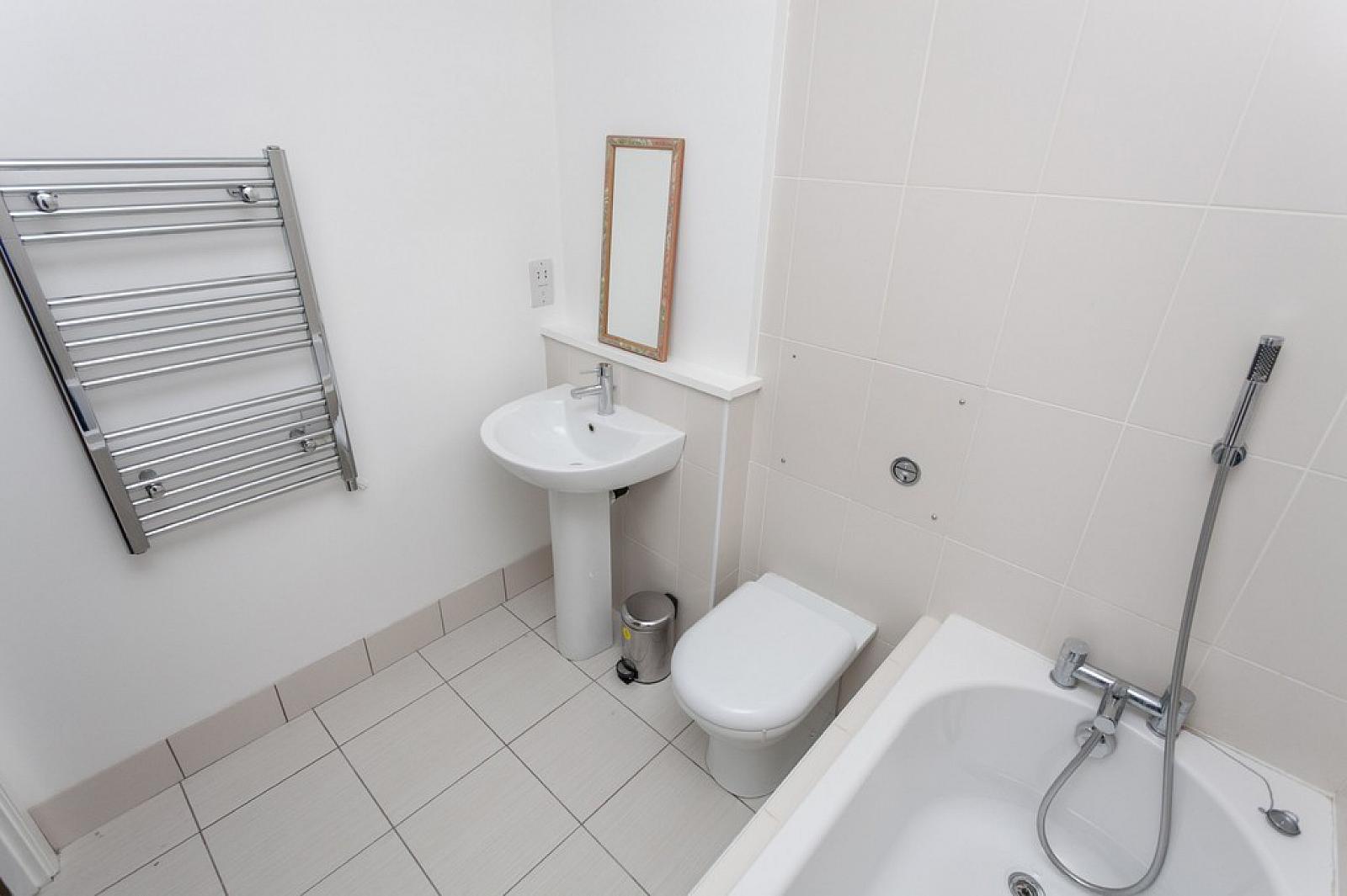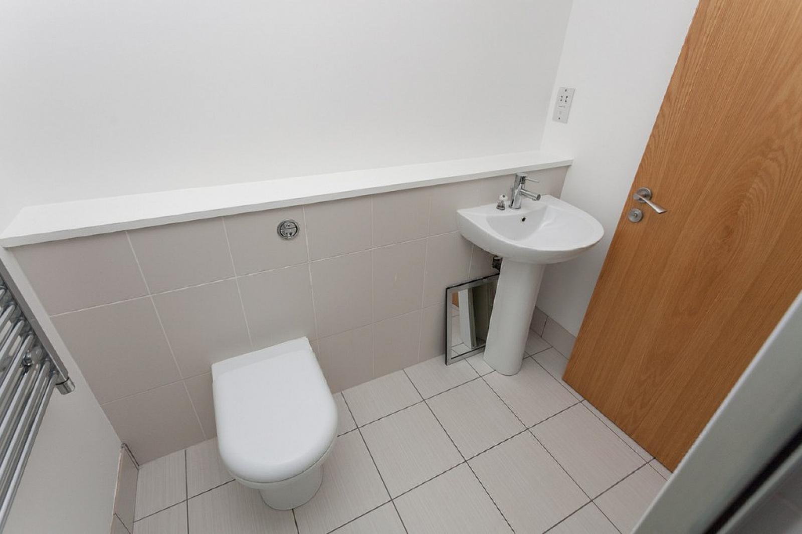 BATHROOM Modern white suite comprising of a panelled bath with hand shower, low flush wc with concealed cistern, pedestal wash hand basin, tiled floor, part tiled walls, stainless steel towel radiator, recessed low voltage spotlights.