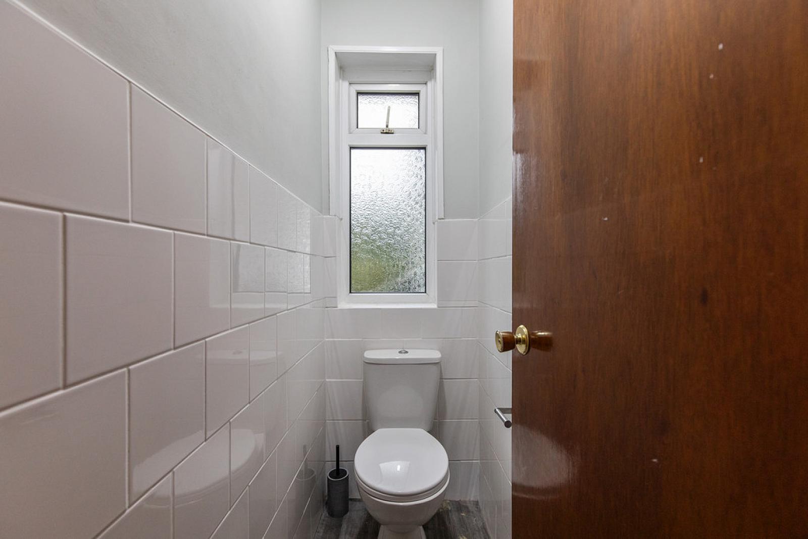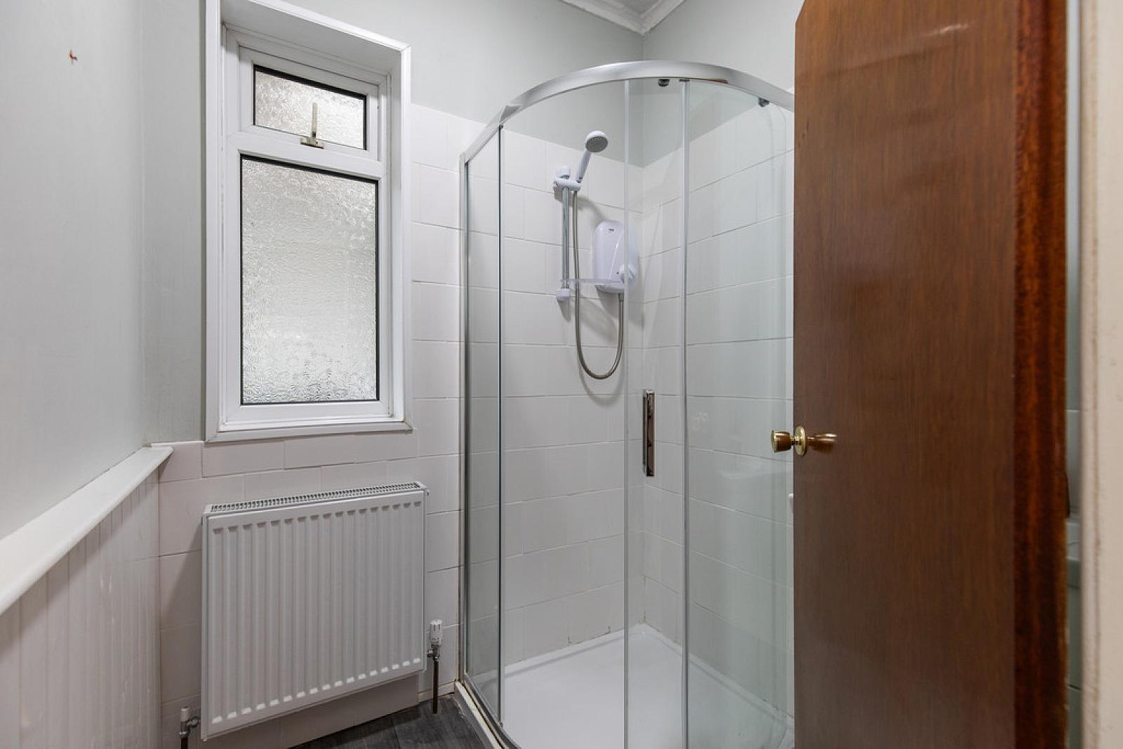 SHOWER ROOM Fully tiled shower cubicle with electric shower over, wash hand basin with chrome taps and storage under, cornicing.