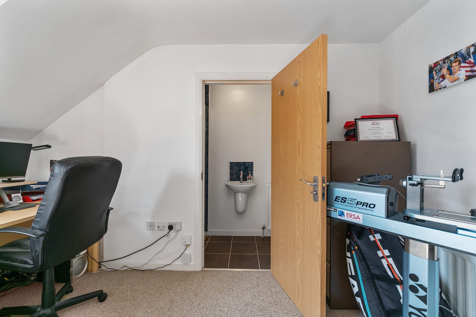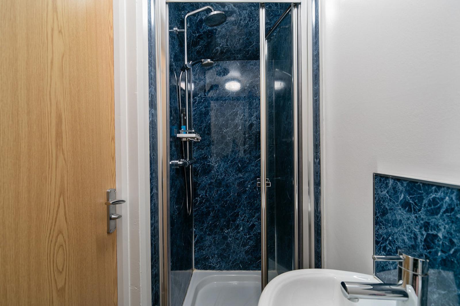 ENSUITE Shower enclosure with thermostatic shower unit. PVC cladding. Low flush wc. Wall mounted wash hand basin with mixer tap and splash back. Extractor fan. Tiled floor.