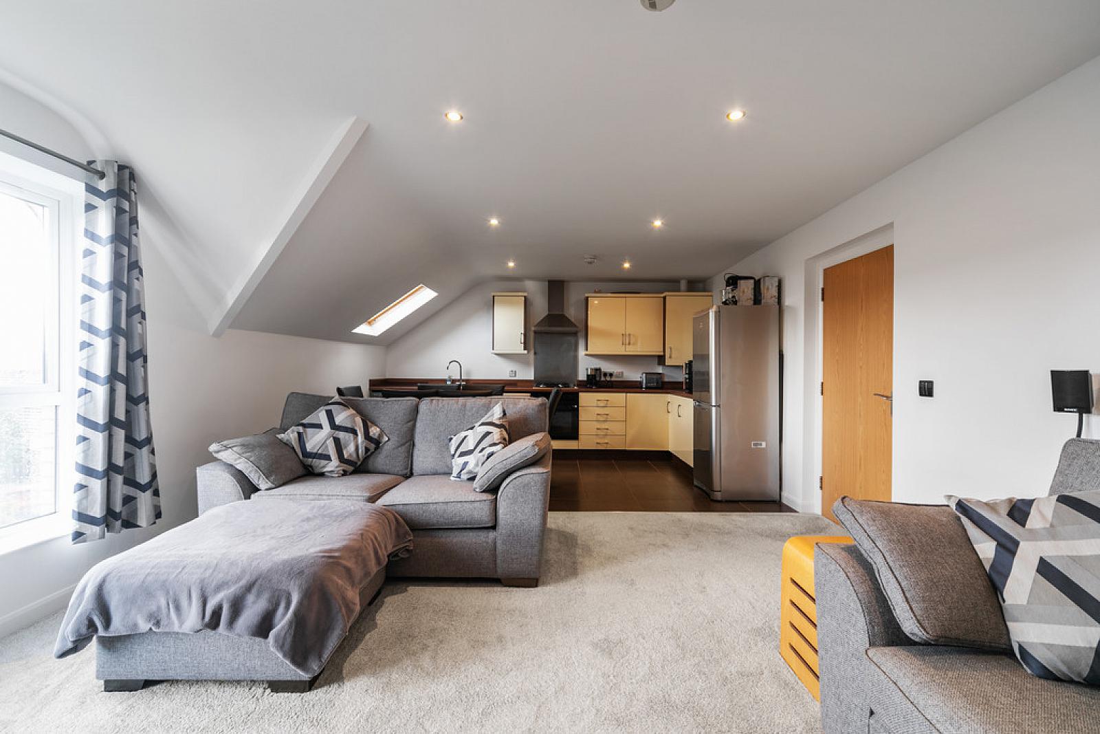 A bright and spacious apartment in excellent condition throughout situated in a convenient location. Internally the apartment offers spacious accommodation comprising an impressive entrance hall, a spacious open plan kitchen / living with dining area, two well proportioned bedrooms with the main bedroom boasting an ensuite shower room and a seperate main bathroom. The apartment also benefits double glazing, gas central heating and great storage with two storage cupboards off the hallway and a private roof space.