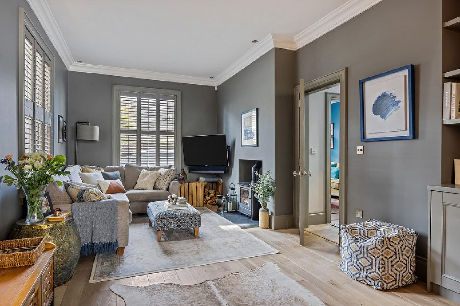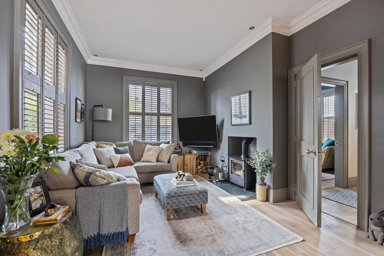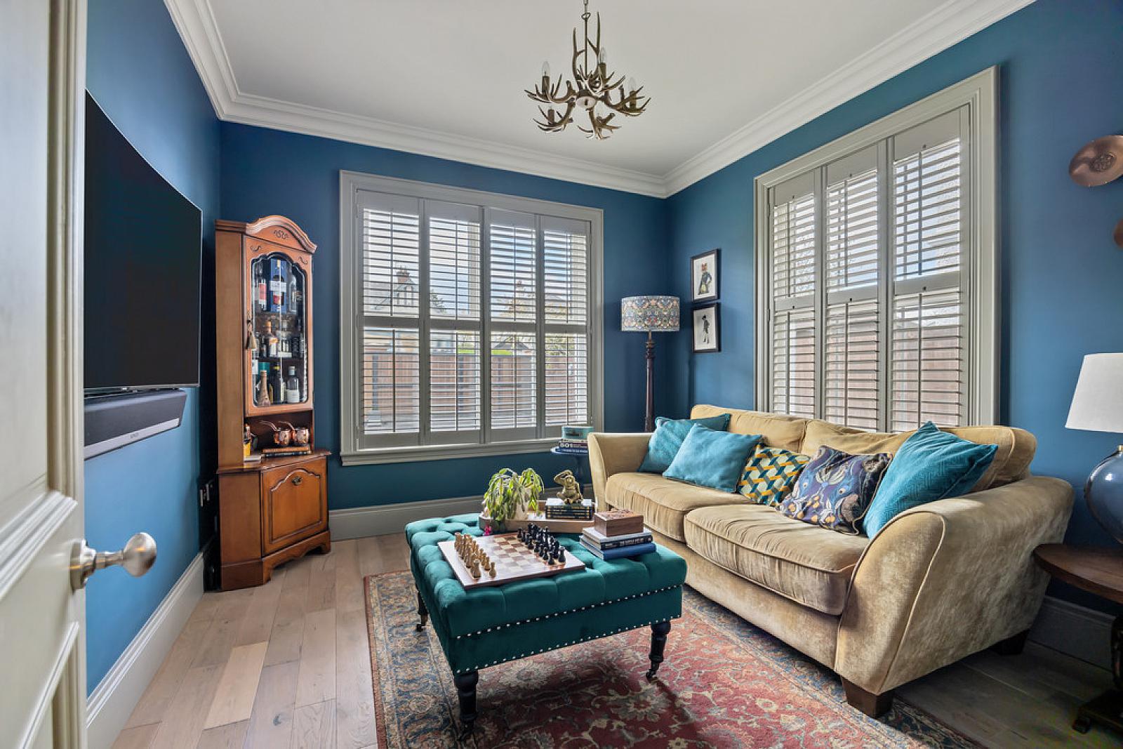 The property opens into a welcoming entrance hall, immediately reflecting the quality and attention to detail found throughout. To the front, a beautifully presented snug or family room provides a warm and inviting retreat, enhanced by dual aspect windows and bespoke shutters.