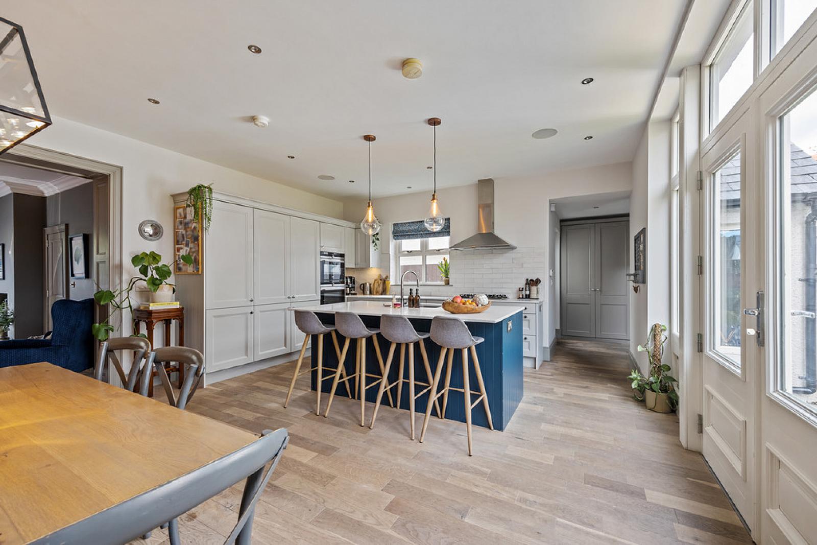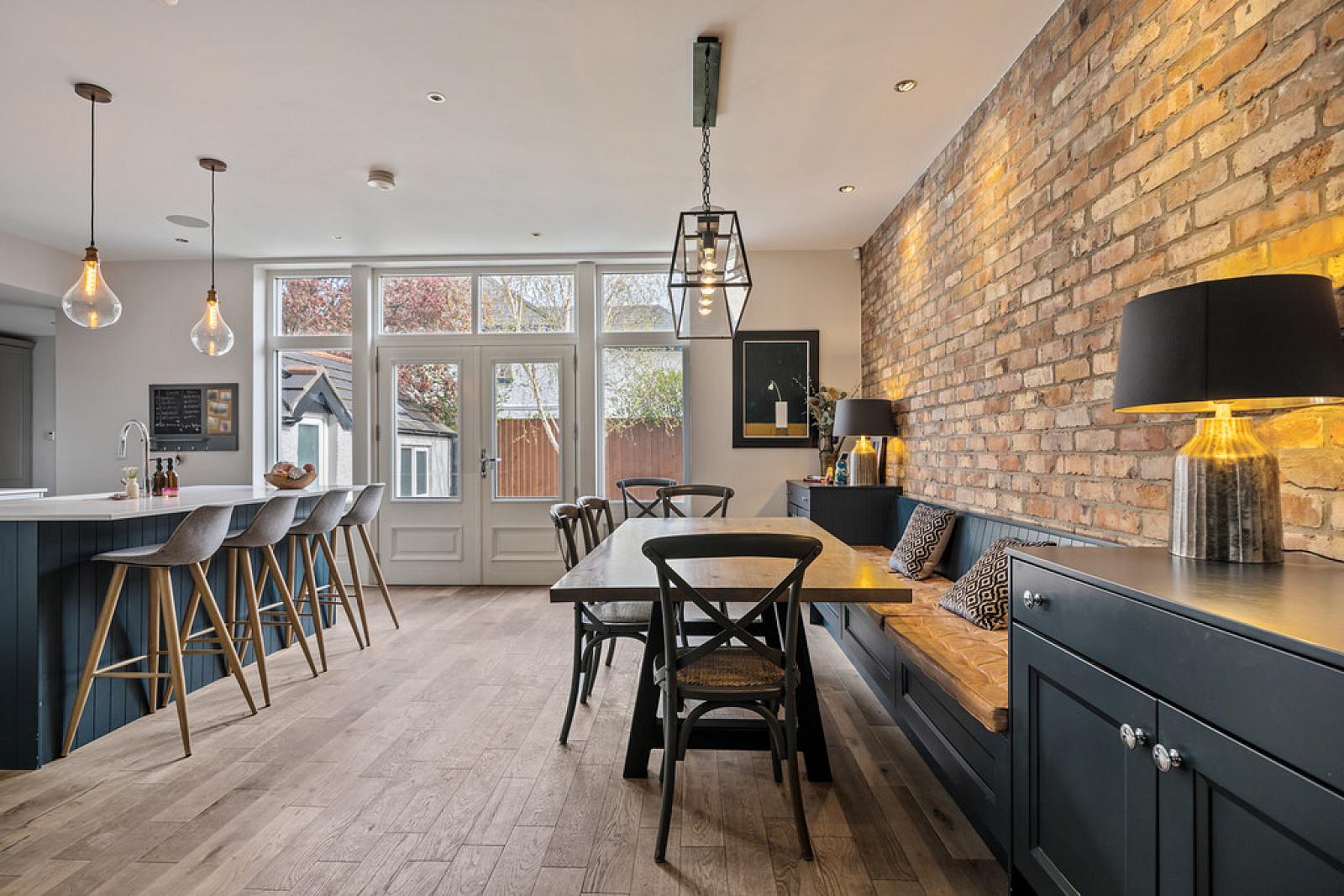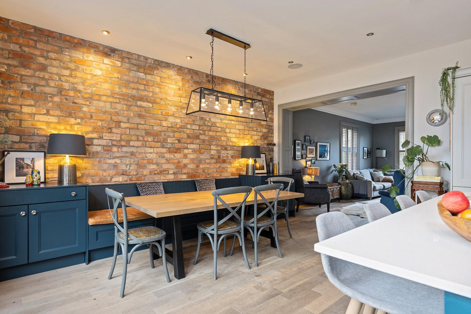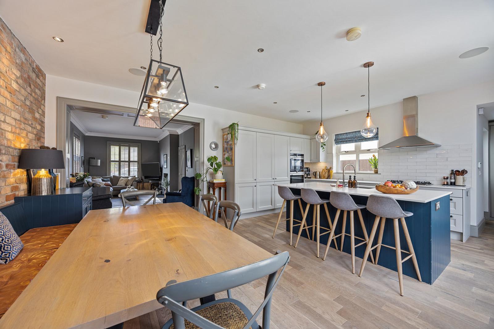 To the rear, the home opens into an impressive open-plan kitchen, dining and living space - the true heart of the home. Designed for both everyday family living and entertaining, this space features a large central island, quartz work surfaces and an extensive range of fitted units and integrated appliances. A striking exposed brick wall, Heta cast iron stove and bespoke built-in shelving create a space that is both functional and full of character, while double doors provide direct access to the private rear garden.