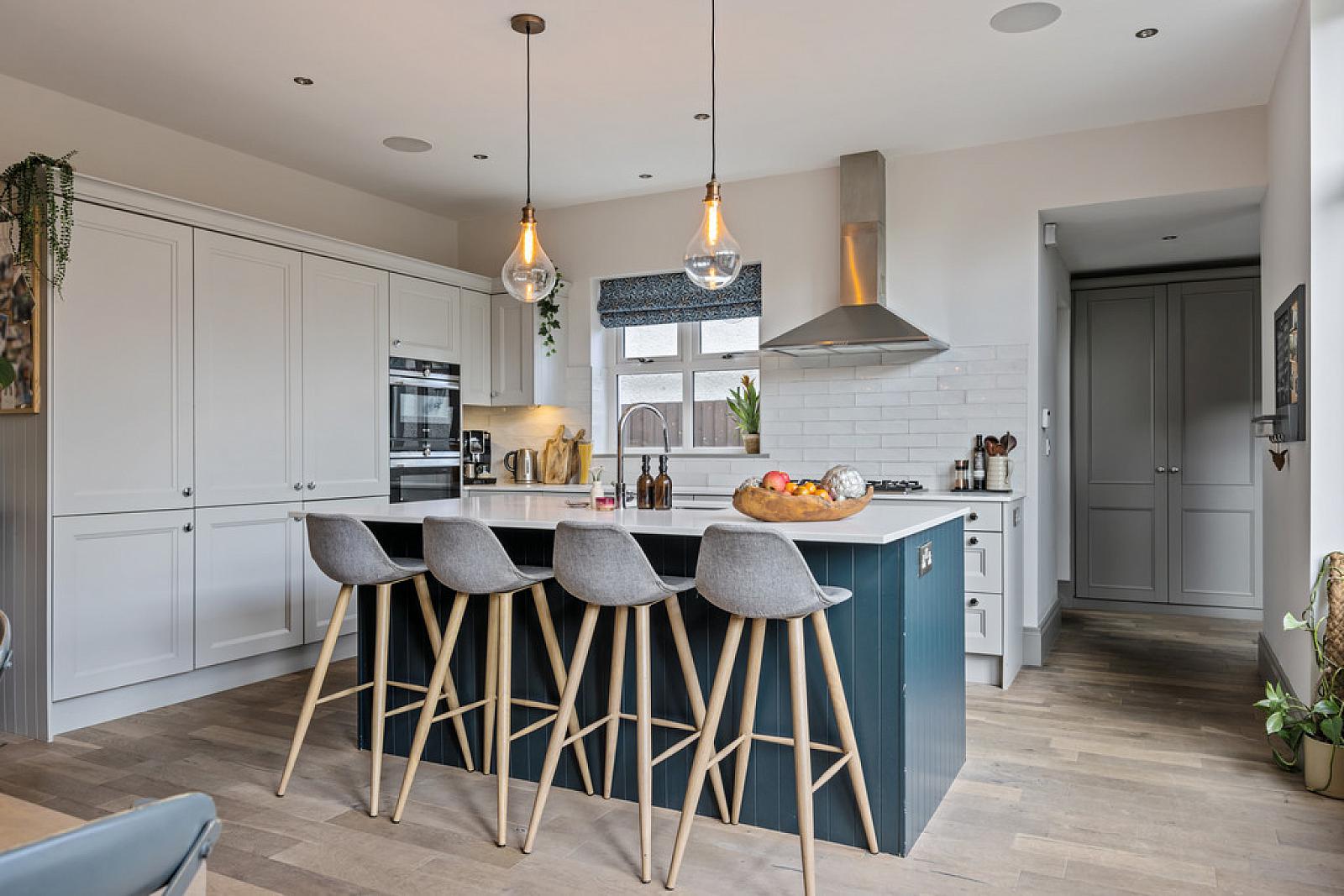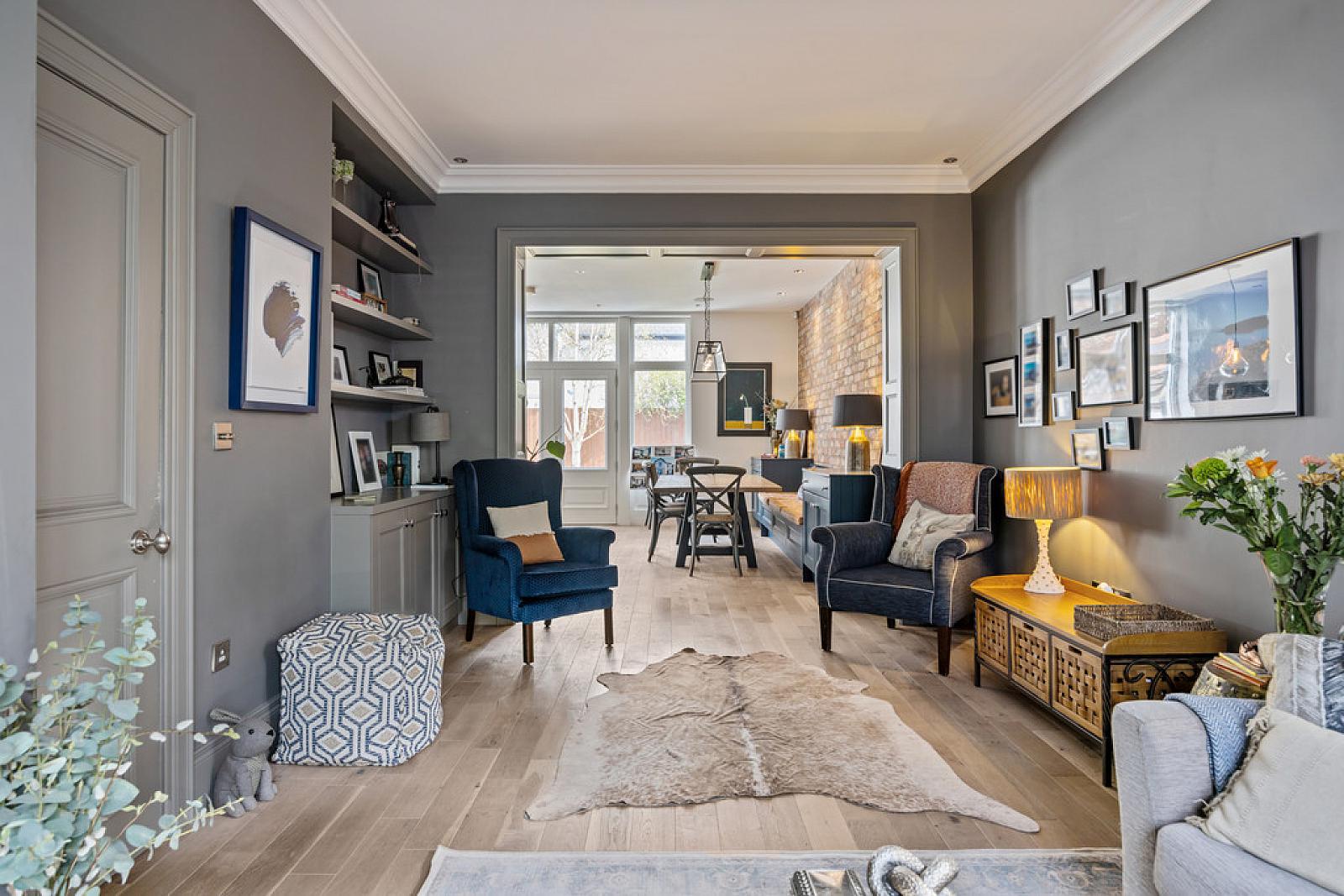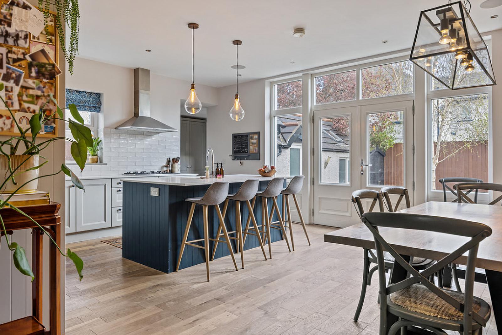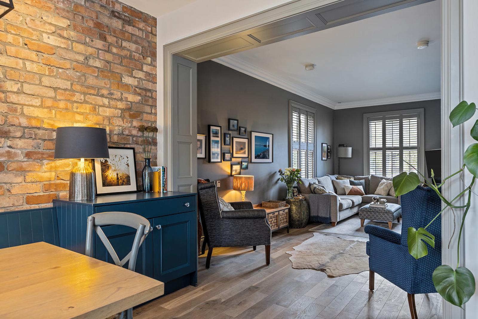 To the rear, the home opens into an impressive open-plan kitchen, dining and living space - the true heart of the home. Designed for both everyday family living and entertaining, this space features a large central island, quartz work surfaces and an extensive range of fitted units and integrated appliances. A striking exposed brick wall, Heta cast iron stove and bespoke built-in shelving create a space that is both functional and full of character, while double doors provide direct access to the private rear garden.