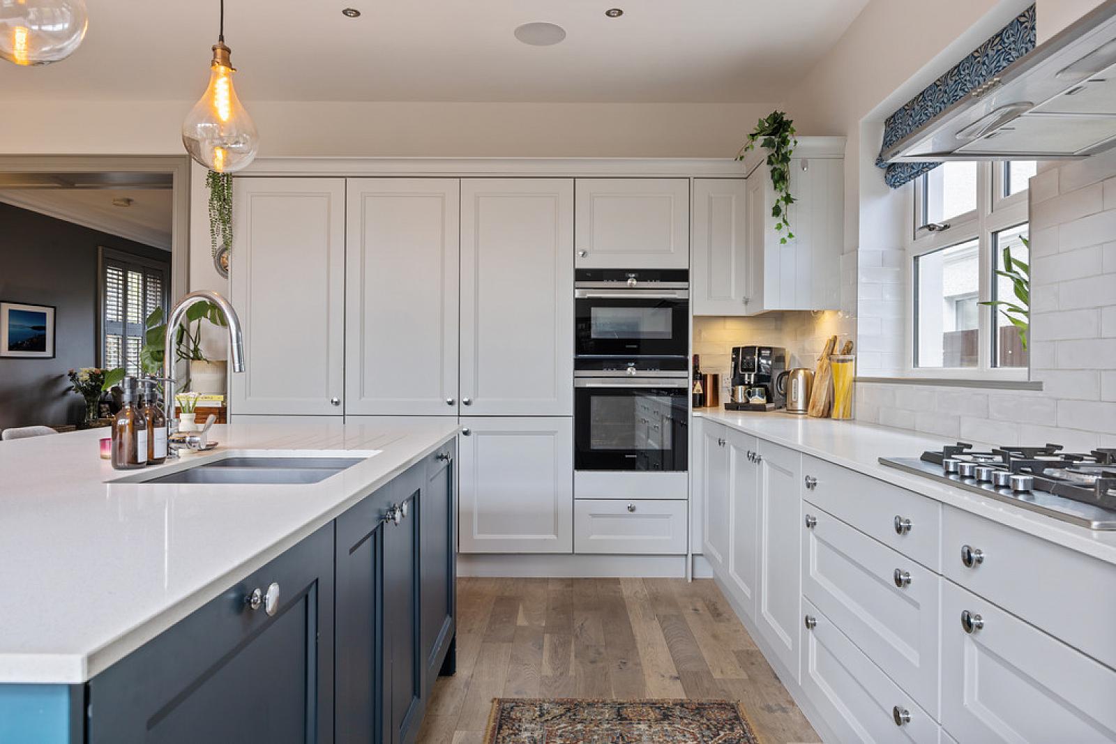 Kitchen fitted with an extensive range of high and low level units, quartz work surfaces, five-ring gas hob with overhead extractor fan, Siemens microwave oven and Siemens oven, larder cupboard, integrated 70/30 fridge freezer, island unit with matching quartz work surface, 1.5 bowl sink unit with quartz drainer, integrated dishwasher, pull-out built-in duo bin and breakfast bar.