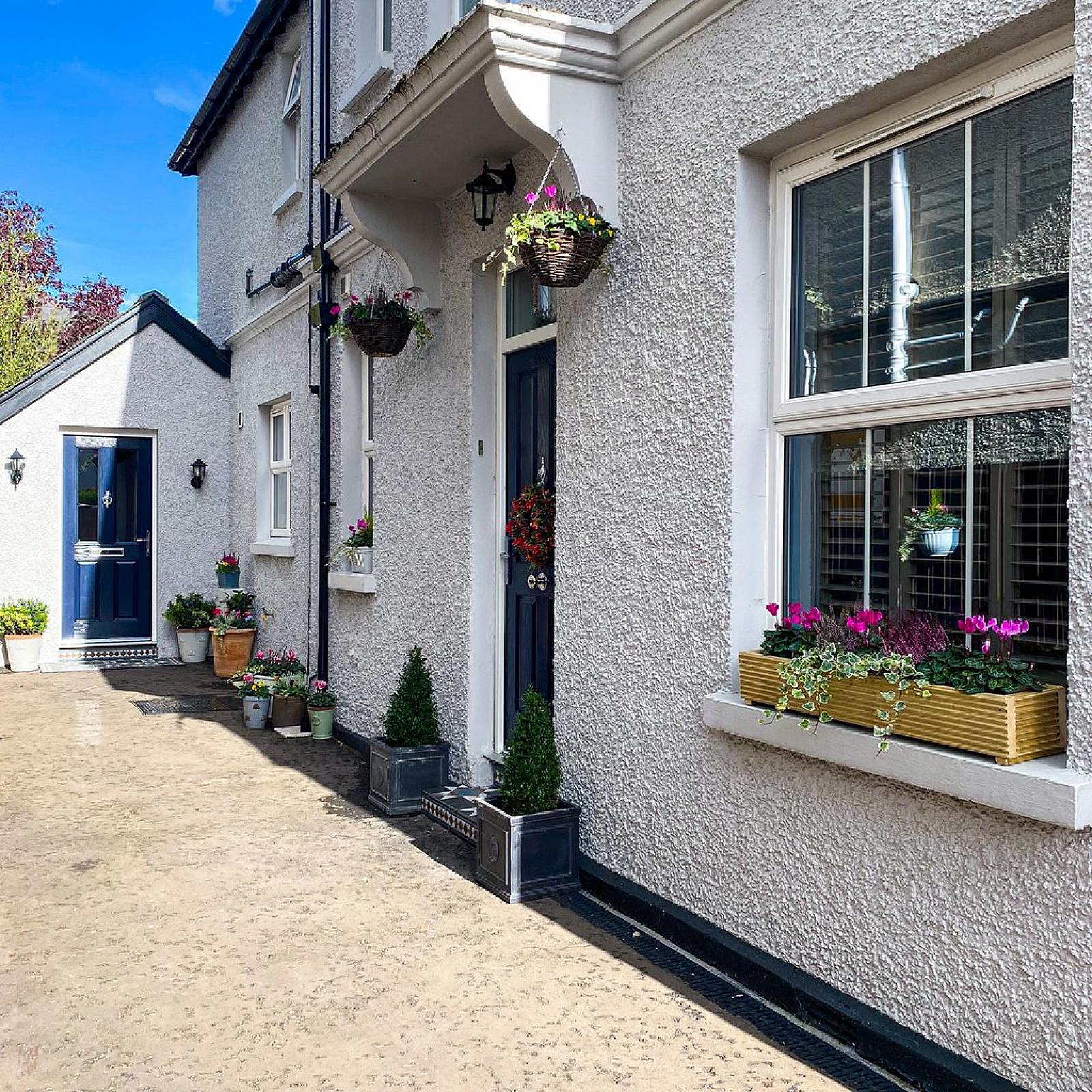 OUTSIDE Private, enclosed site with app or fob-controlled electric entrance gates leading to an extensive parking area to the front with flower beds.