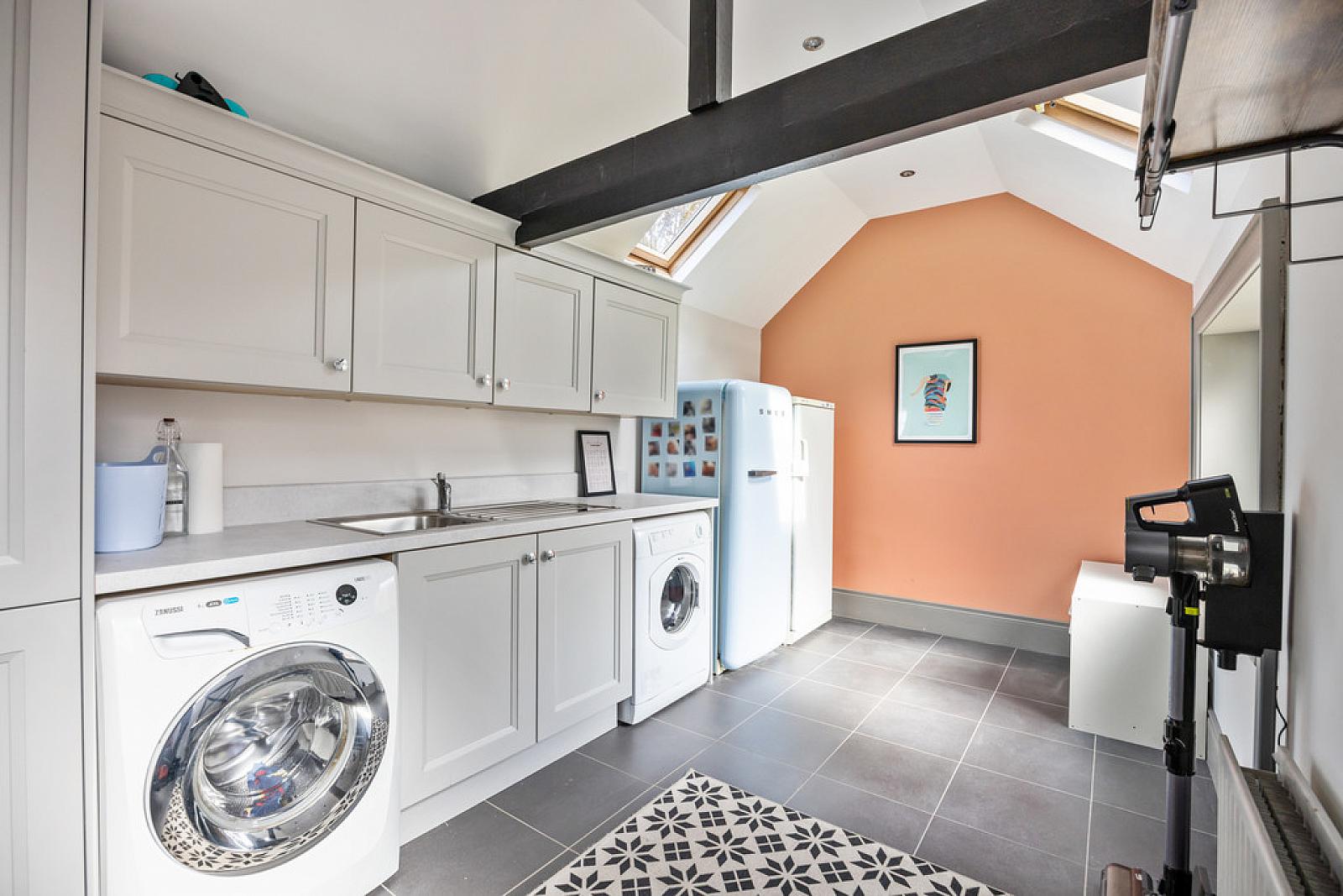 UTILITY ROOM 16' 6" x 8' 3" (5.03m x 2.51m) Range of high and low level units, work surfaces with matching splashback, single drainer stainless steel sink unit with mixer tap, plumbed for washing machine, space for tumble dryer, uPVC double glazed door to rear garden, feature exposed beam and Velux windows.