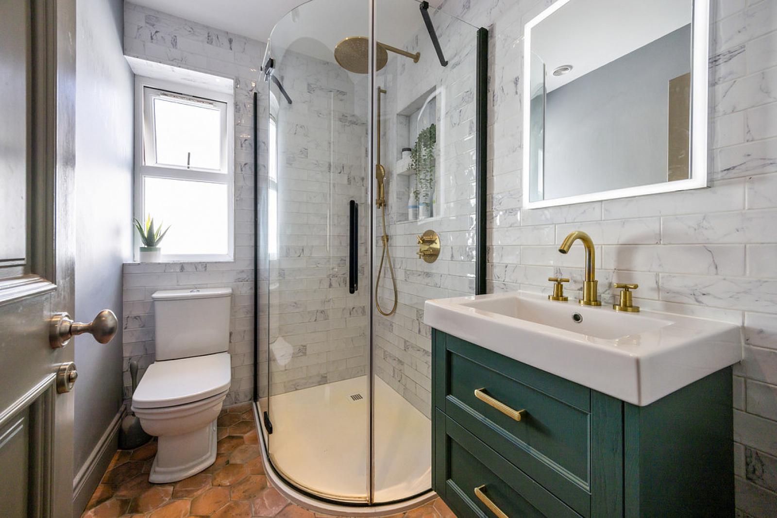 ENSUITE SHOWER ROOM White suite comprising low flush WC and vanity unit with storage. Fully tiled shower cubicle with rainwater shower and built-in shelving, LED mirror storage cabinet with shaver socket, part tiled walls, extractor fan, low voltage spotlights, heated towel rail.