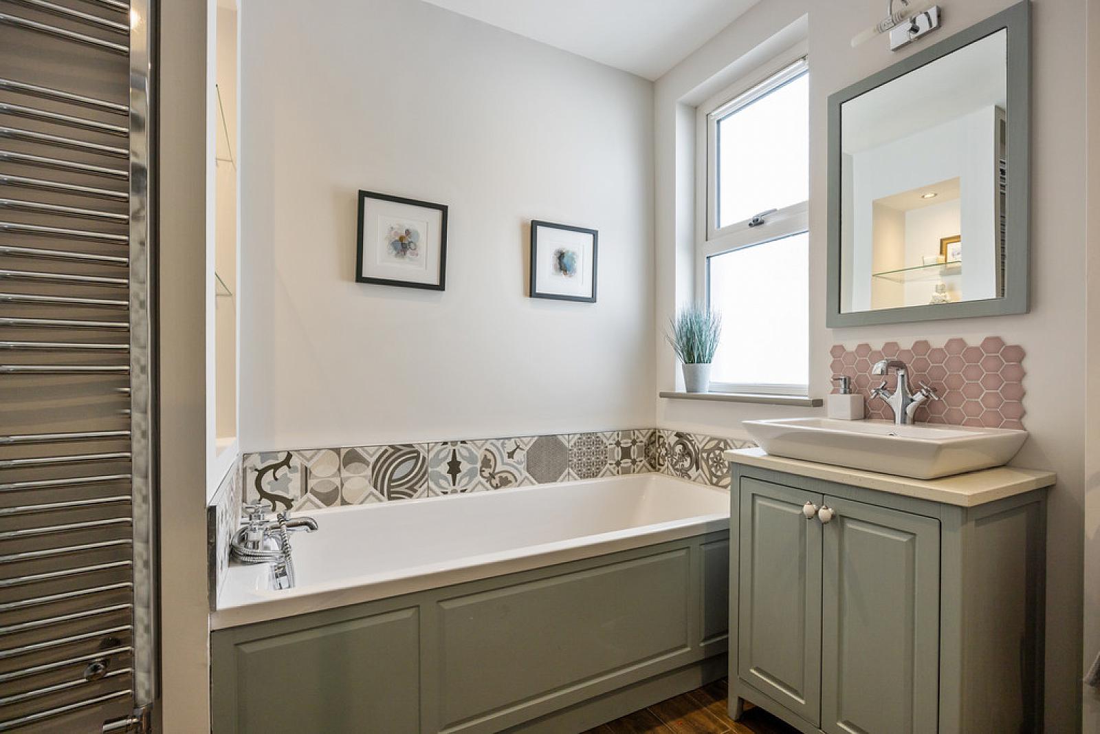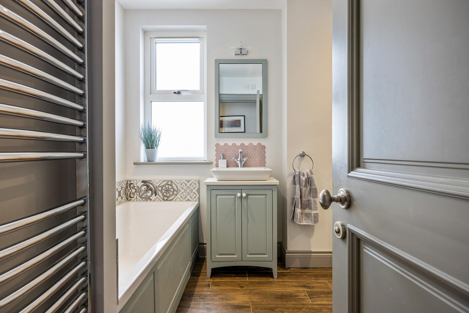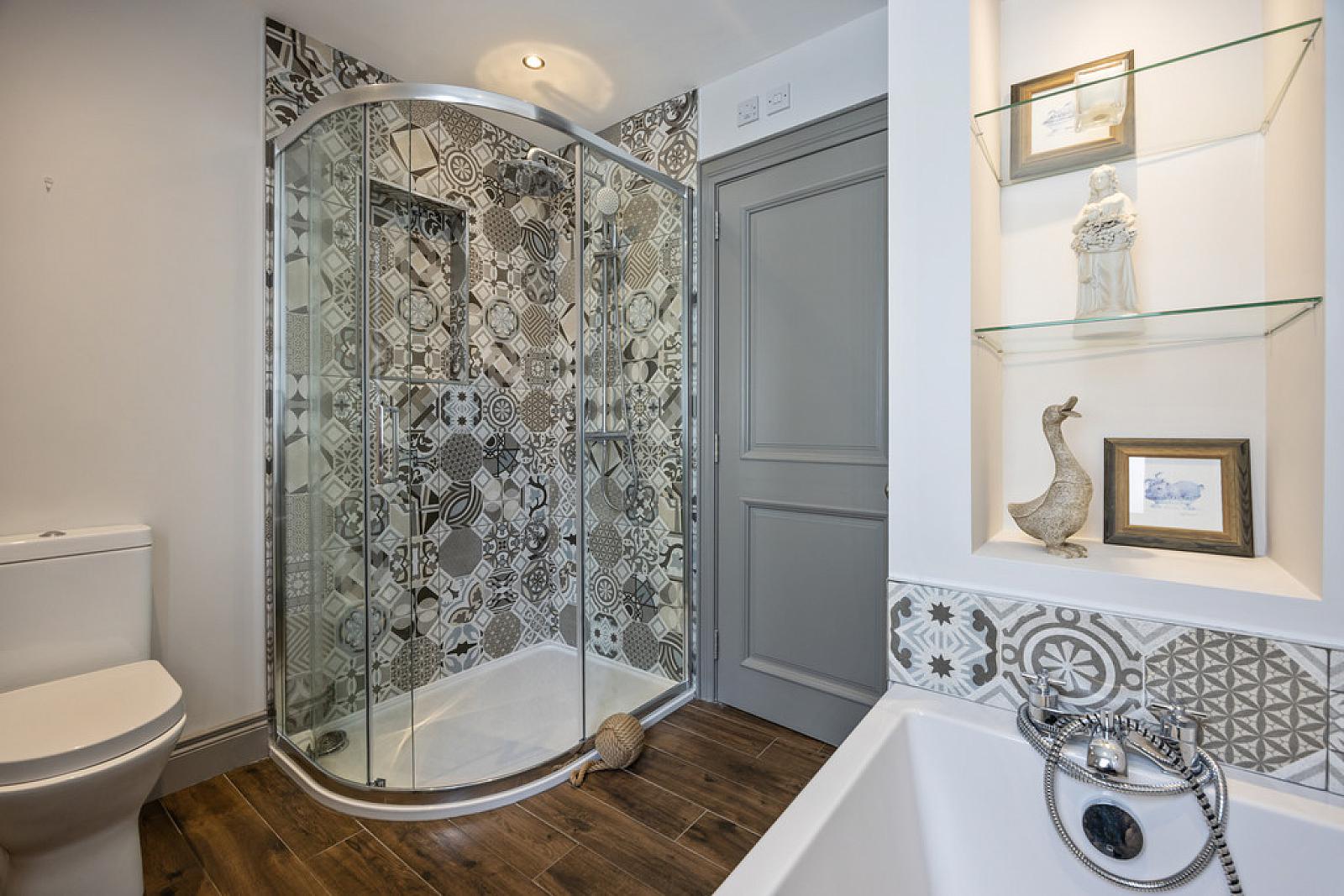 BATHROOM White suite comprising panelled bath with splash tiling, vanity unit with storage, low flush WC. Fully tiled shower cubicle with rainwater shower and built-in shelf, wood-effect tiled floor, heated towel rail, low voltage spotlights, extractor fan, built-in glass shelving.