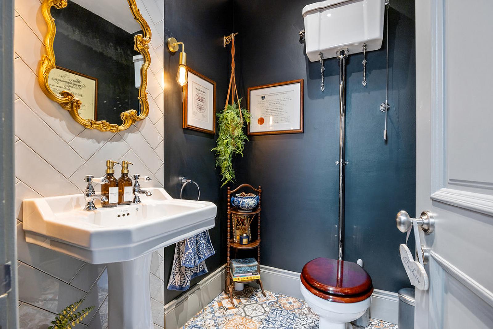 CLOAKROOM / WC White suite comprising high flush WC and pedestal wash hand basin. Floor-to-ceiling splash tiling, feature tiled floor, zoned underfloor heating, low voltage spotlights, extractor fan.